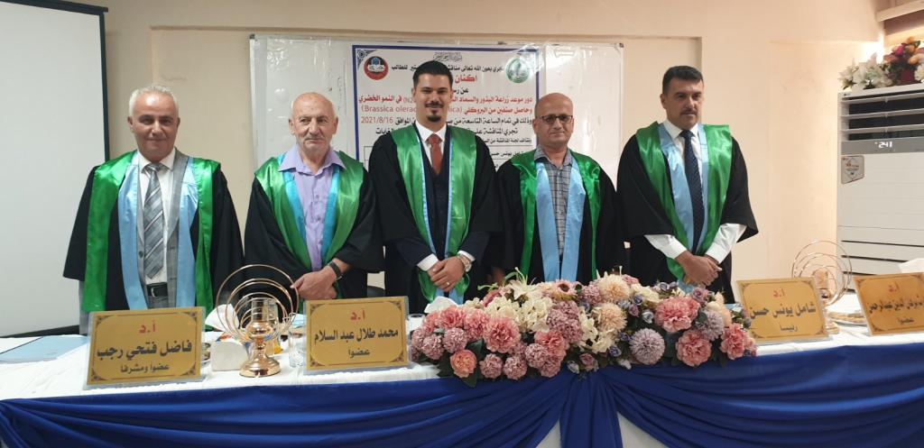 نوقشت صباح اليوم رسالة الماجستير في قسم البستنة وهندسة الحدائق في كليتنا تقدم بها الطالب اكنان علي محمود والموسومة (دور موعد زراعة البذور والسماد النانوي في النمو الخضري وحاصل صنفين من البروكلي (Brassica oleracea Var.italica)) حضر الأستاذ الدكتور محمد يونس العلاف عميد الكلية جانب من أجواء المناقشة. هدفت الدراسة لبيان تأثير ثلاثة مواعيد لزراعة البذور (1/8 و15/8 و1/9) والرش بالسماد النانوي N20P20K20 بثلاثة تراكيز (0 و 2 و 4 غم.لتر-1)، بينت أهم النتائج تفوق الموعد الثاني معنويا على بقية المواعيد وكذلك تراكيز السماد النانوي في تحسين صفات النمو الخضري والزهري والحاصل للنبات.