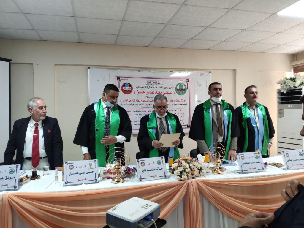 وقد ترأس لجنة المناقشة الأستاذ الدكتور أخالد محمد داؤد وعضوية الأستاذ المساعد الدكتور حسين علي هندي والأستاذ المساعد الدكتور محمد صبحي مصطفى الطويل والأستاذ الدكتور موفق جبر الليلة عضواً ومشرفاً والدكتور زكريا بدر فتحي عضواً ومشرفاً.