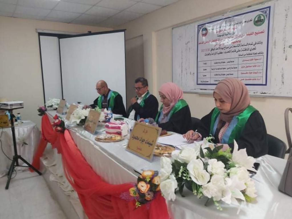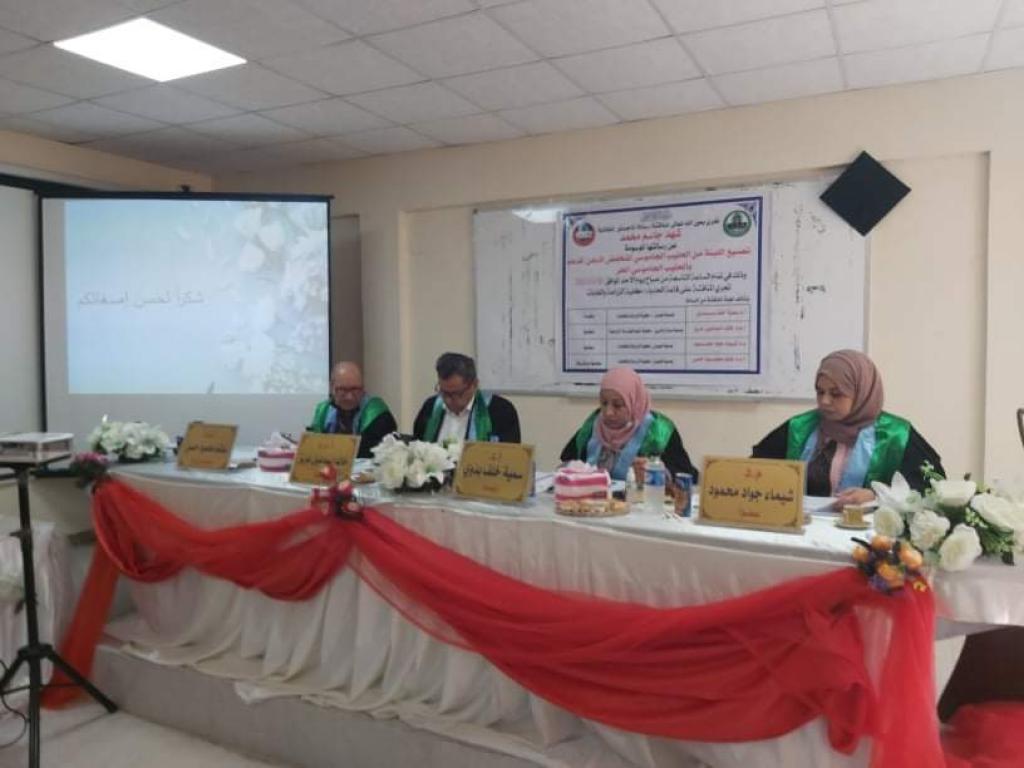 وقد تألفت لجنة المناقشة من الأستاذ الدكتورة سمية خلف بدوي رئيساً وعضوية كل من الأستاذ المساعد الدكتور خالد اسماعيل عزيز والمدرس الدكتور شيماء جواد محمود والأستاذ المساعد الدكتورغانم محمود مشرفاً