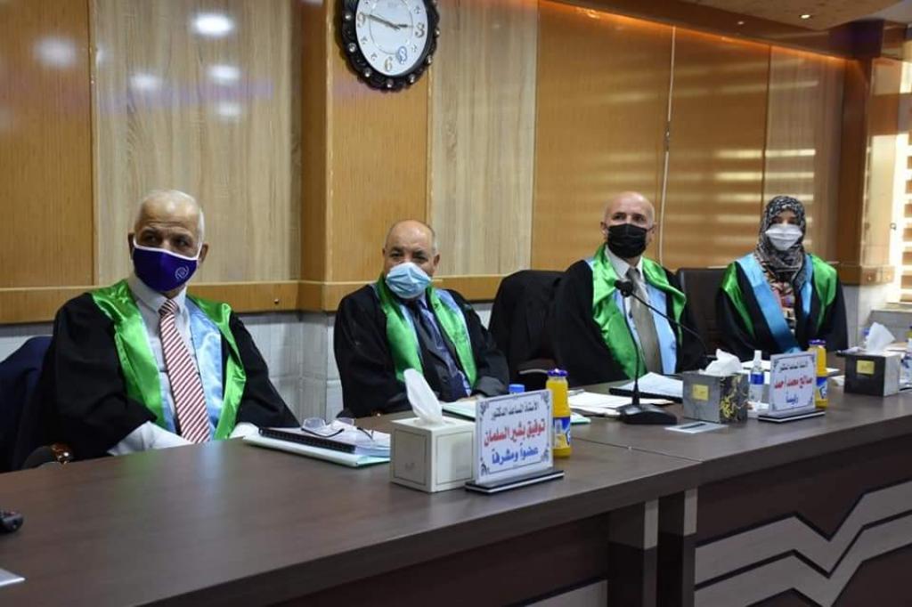 وتألفت لجنة المناقشة من الأستاذ المساعد الدكتور صالح محمد الراشدي رئيسا وعضوية الأستاذ المساعد الدكتور مصطفى إسماعيل عمر والدكتوره رند عبدالهادي غزال والأستاذ الدكتور توفيق بشير السلمان عضواً ومشرفاً