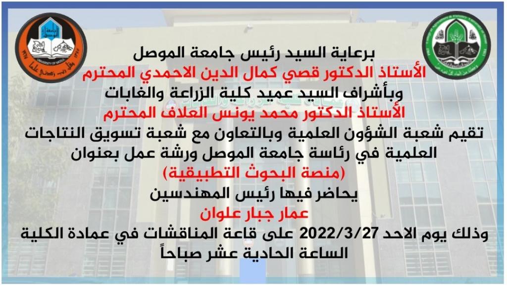 برعاية السيد رئيس جامعة الموصل وبالتعاون مع شعبة تسويق النتاجات العلمية في رئاسة الجامعة وبحضور السيد عميد الكلية الاستاذ الدكتور محمد يونس العلاف أقامت شعبة الشؤون العلمية في كليتنا ورشة عمل بعنوان منصة البحوث التطبيقية القى فيها رئيس المهندسين الاستاذ عمار جبار علوان محاضرة فيها تناولت أهمية وكيفية التسجيل في المنصة .