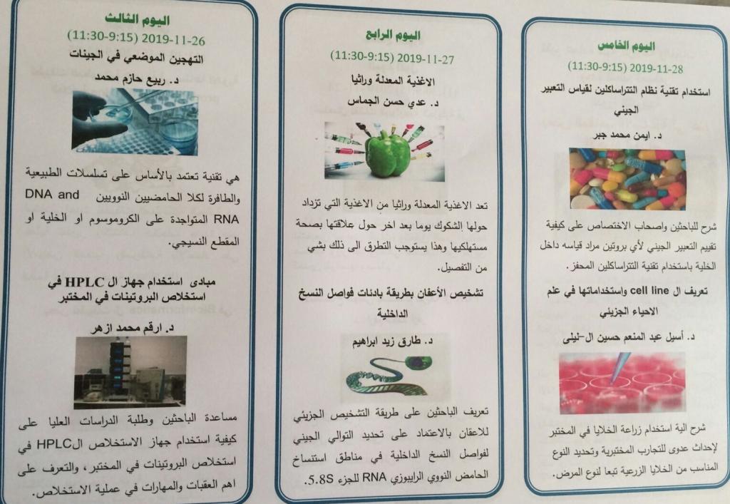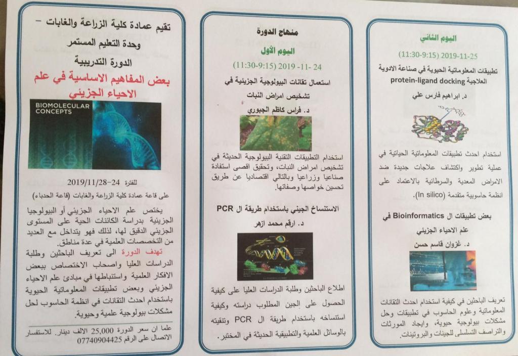 ستقيم شعبة العلوم الأساسية في كليتنا دورة تدريبية ضمن دورات التعليم المستمر بعنوان (بعض المفاهيم الأساسية في علم الأحياء الجزيئي) وذلك للمدة من 24 – 2019/11/28 وعلى قاعة الحدباء في عمادة الكلية علما أن أجور المشاركة في الدورة (٢٥٠٠٠ دينار) والتسجيل في وحدة التعليم المستمر