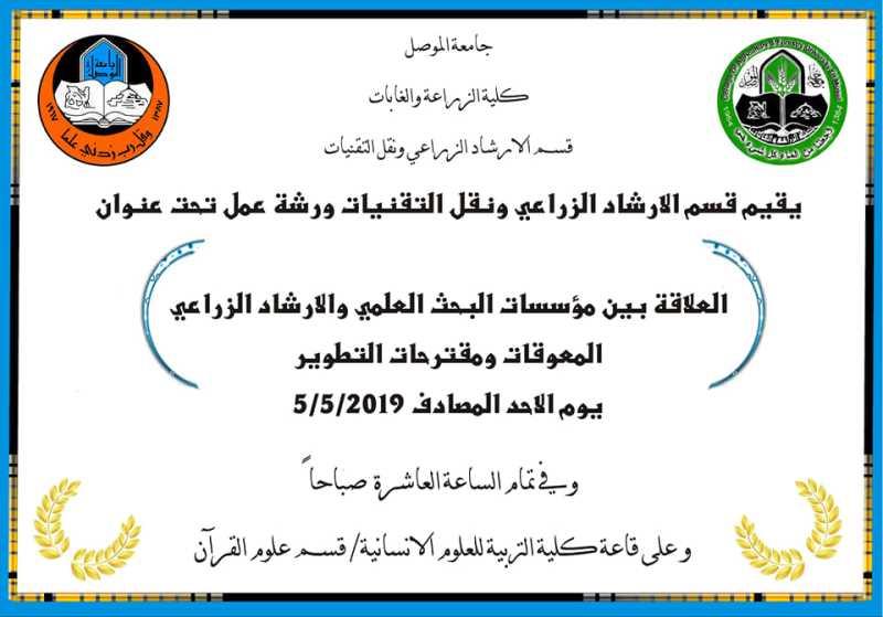 سيقيم قسم الارشاد الزراعي ونقل التقانات في كليتنا ورشة عمل بعنوان ( العلاقة بين مؤسسات البحث العلمي والارشاد الزراعي _ السلبيات ومقترحات التطوير ) يوم الاحد القادم الموافق 5 / ايار / 2019 على قاعة قسم علوم القران / كلية التربية للعلوم الانسانية وفي تمام الساعة العاشرة صباحا والدعوة عامة للجميع .