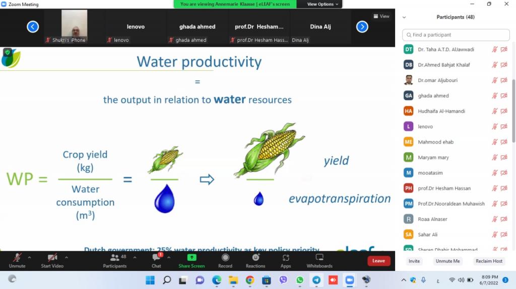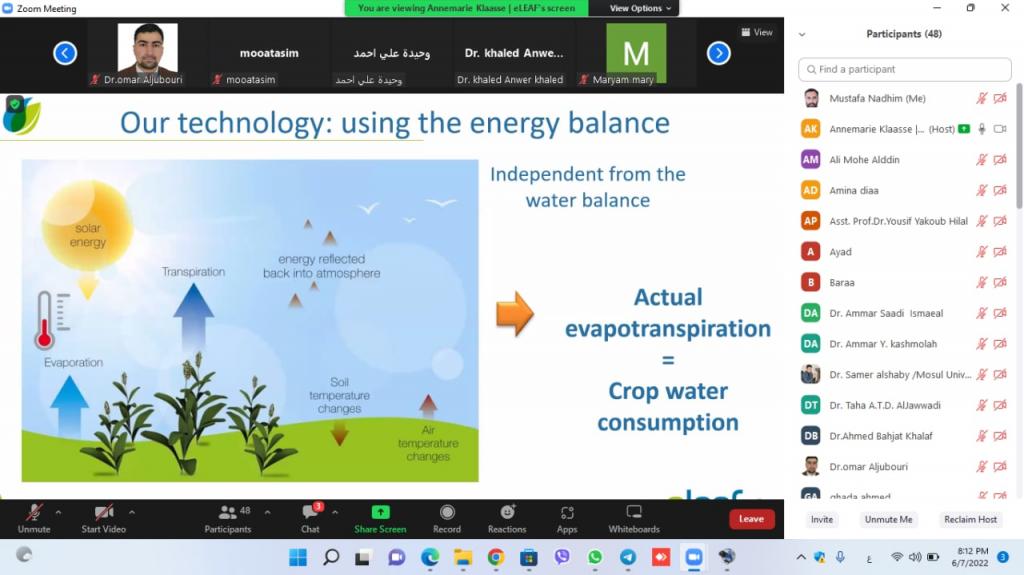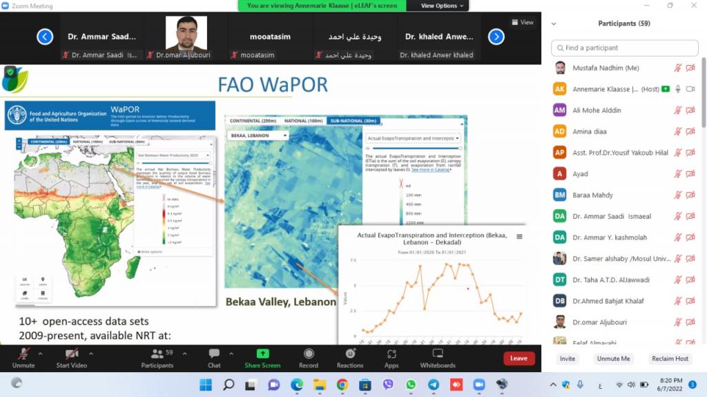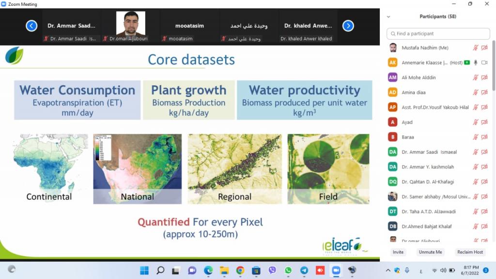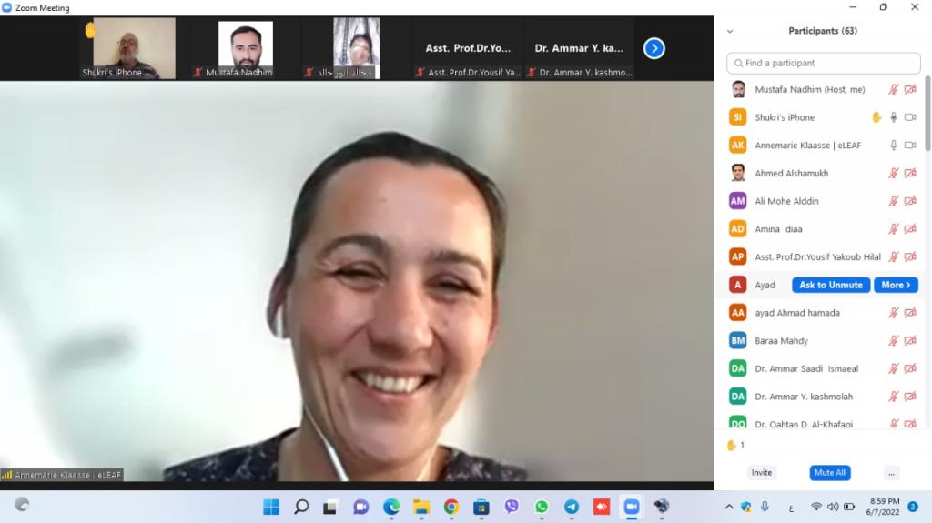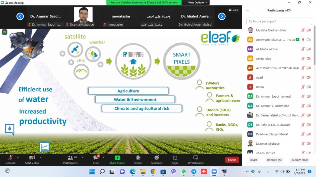 برعاية السيد عميد الكلية الأستاذ الدكتور محمد يونس العلاف وباشرف الدكتور عمار يونس كشمولة رئيس القسم اقام قسم علوم التربة والموارد المائية وبالتعاون مع الدكتورة Annemarie Klasse اختصاص تحسس نائي وإدارة المياه من مؤسسة eLEAF الهولندية والمحاضرة في IHE للدراسات العليا في هولندا ورشة عمل إلكترونية والموسومة ( استخدام تقنات التحسس النائي في الزراعة).