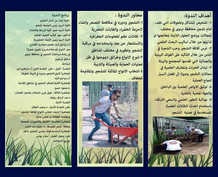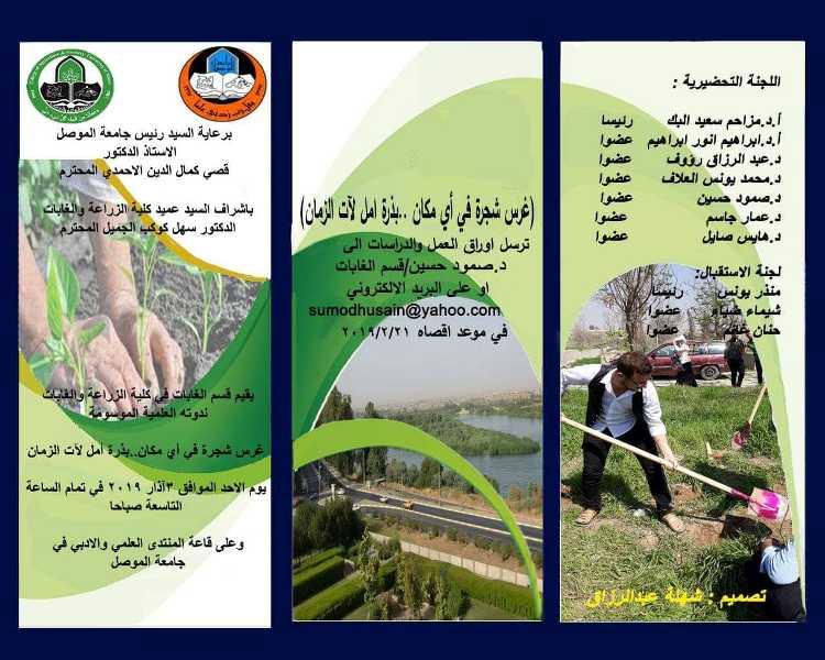 برعاية السيد رئيس جامعة الموصل الاستاذ الدكتور قصي كمال الدين الاحمدي المحترم وبإشراف السيد عميد الكلية الدكتور سهل كوكب الجميل يقيم قسم الغابات في كليتنا ندوته العلمية الموسومة ( غرس شجرة في اي مكان … بذرة امل لات الزمان ) في تمام الساعة التاسعة صباحا من يوم الاحد الموافق 3 / اذار / 2019 على قاعة المنتدى العلمي والأدبي في جامعة الموصل ، فعلى الراغبين بالمشاركة مراجعة قسم الغابات لتسجيل اسماؤهم مع التقدير.