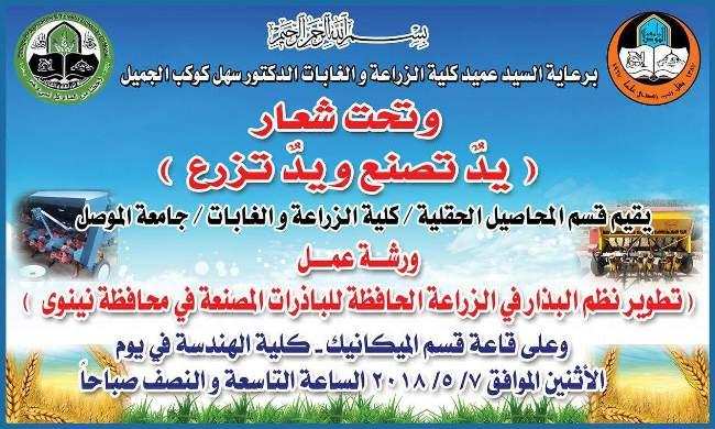 تحت شعار يد تصنع ويد تزرع وبرعاية السيد عميد كلية الزراعة والغابات الدكتور سهل كوكب الجميل يسر قسم المحاصيل الحقلية ان يدعوكم لحضور ورشة العمل التي يقيمها حول تطوير نظم البذار في الزراعة الحافظة للباذرات المصنعة في محافظة نينوى وذلك على قاعة قسم الميكانيك في كلية الهندسة الساعة التاسعة والنصف من يوم الاثنين الموافق 2018/5/7 .