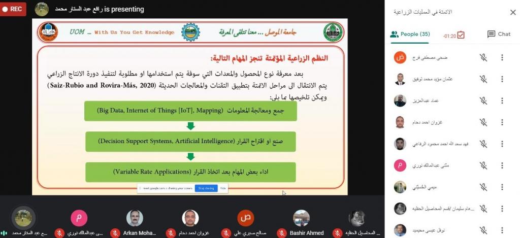 برعاية السيد عميد الكلية الدكتور محمد يونس العلاف وباشراف رئاسة قسم المكائن والآلات الزراعية وضمن دورات التعليم المستمر الطائي اقام قسم المكائن والآلات الزراعية دورة تدريبية عبر برنامج Google Meet الالكتروني حملت عنوان ((الاتمتة في العمليات الزراعية)) وتستمر لمدة ٤ ابام . وبدأت الدورة بكلمة للسيد رئيس القسم رحب فيها بالحضور في هذه الدورة مثمناً جهود عمادة الكلية والمحاضرين فيها، ثم القيت محاضرة الافتتاح للدكتور رافع عبد الستار محمد التدريسي في القسم.