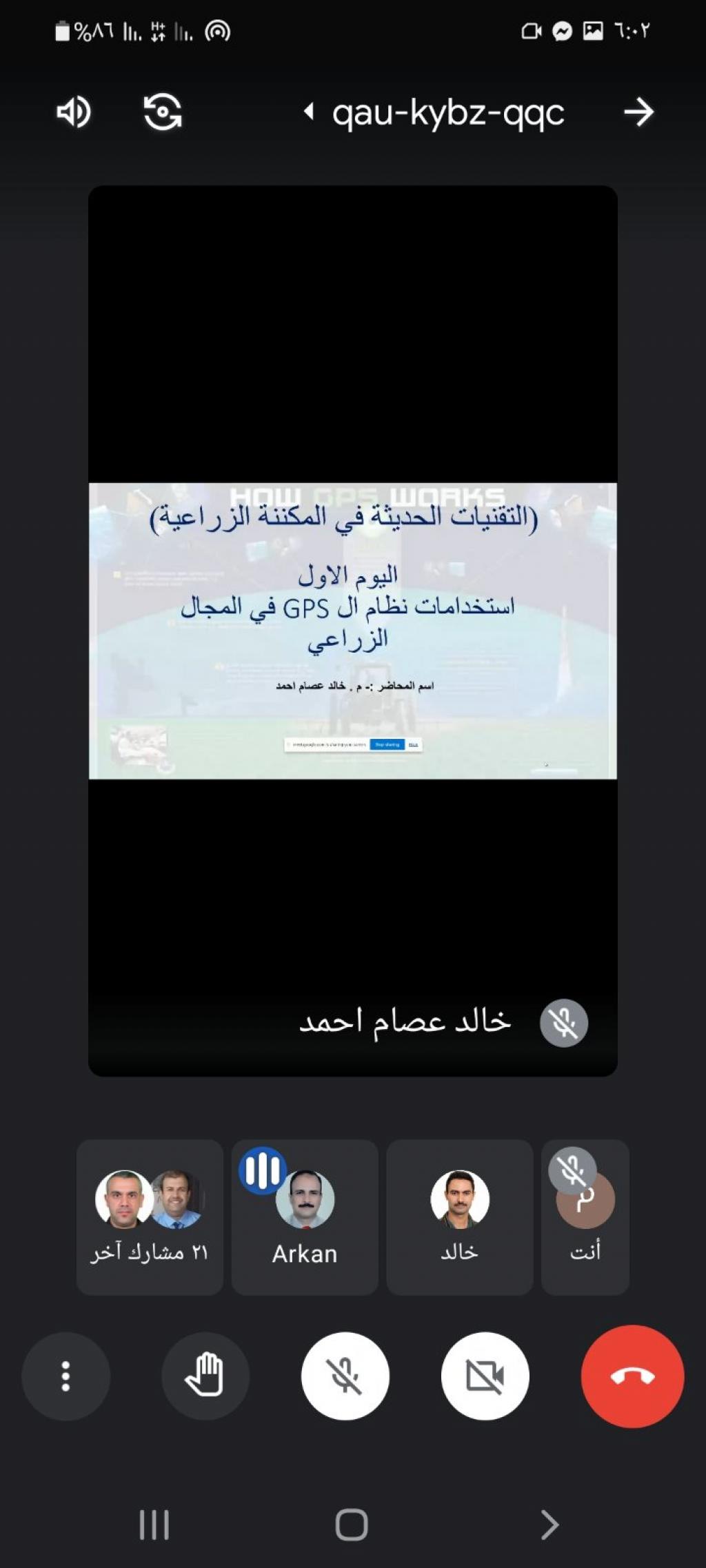برعاية السيد عميد كلية الزراعة والغابات الدكتور محمد يونس العلاف وبأشراف الدكتور اركان محمد امين رئيس القسم أقام قسم المكائن والالات الزراعية دورة علمية الكترونية بعنوان((التقنيات الحديثة في المكننة الزراعية )) اليوم الاحد وستستمر هذه الدورة لمدة ٤ ايام اذ القيت ضمن منهاج الدورة لليوم الأول المحاضرة الاولى بعنوان (استخدام نظام ال GPS في المجال الزراعي) للتدريسي في القسم السيد خالد عصام احمد.