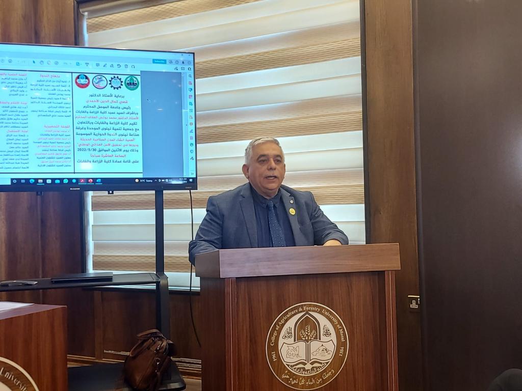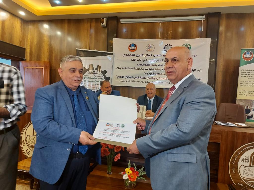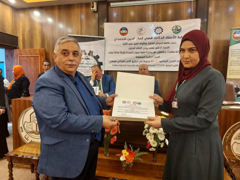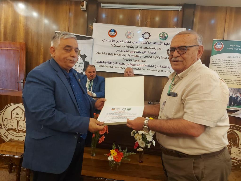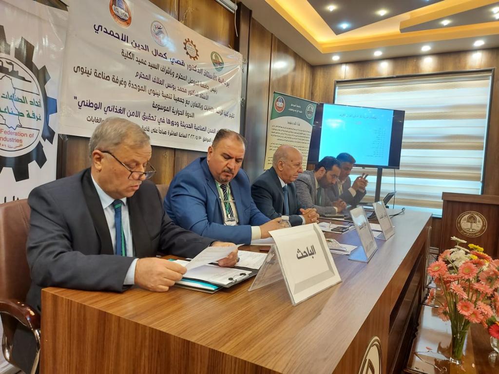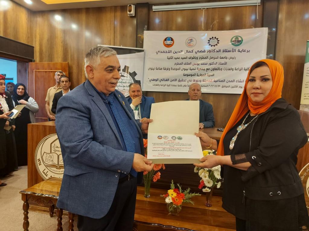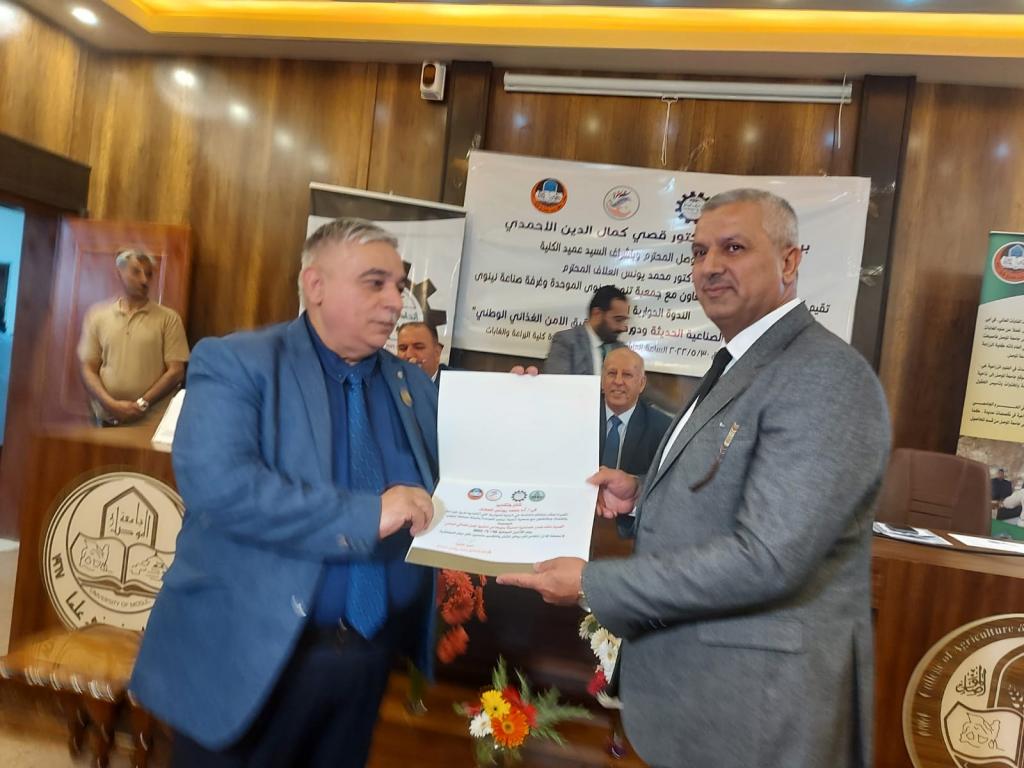 برعاية الأستاذ الدكتور قصي كمال الدين الاحمدي رئيس جامعة الموصل وبحضور الاستاذ الدكتور منير سالم طه مساعد رئيس الجامعة للشؤون العلمية وباشراف السيد عميد الكلية الأستاذ الدكتور محمد يونس العلاف اقامت كلية الزراعة والغابات وبالتعاون مع جمعية تنمية نينوى الموحدة وغرفة صناعة نينوى الندوة الحوارية الموسومة “أهمية انشاء المدن الصناعية الحديثة ودورها في تحقيق الامن الغذائي الوطني” .