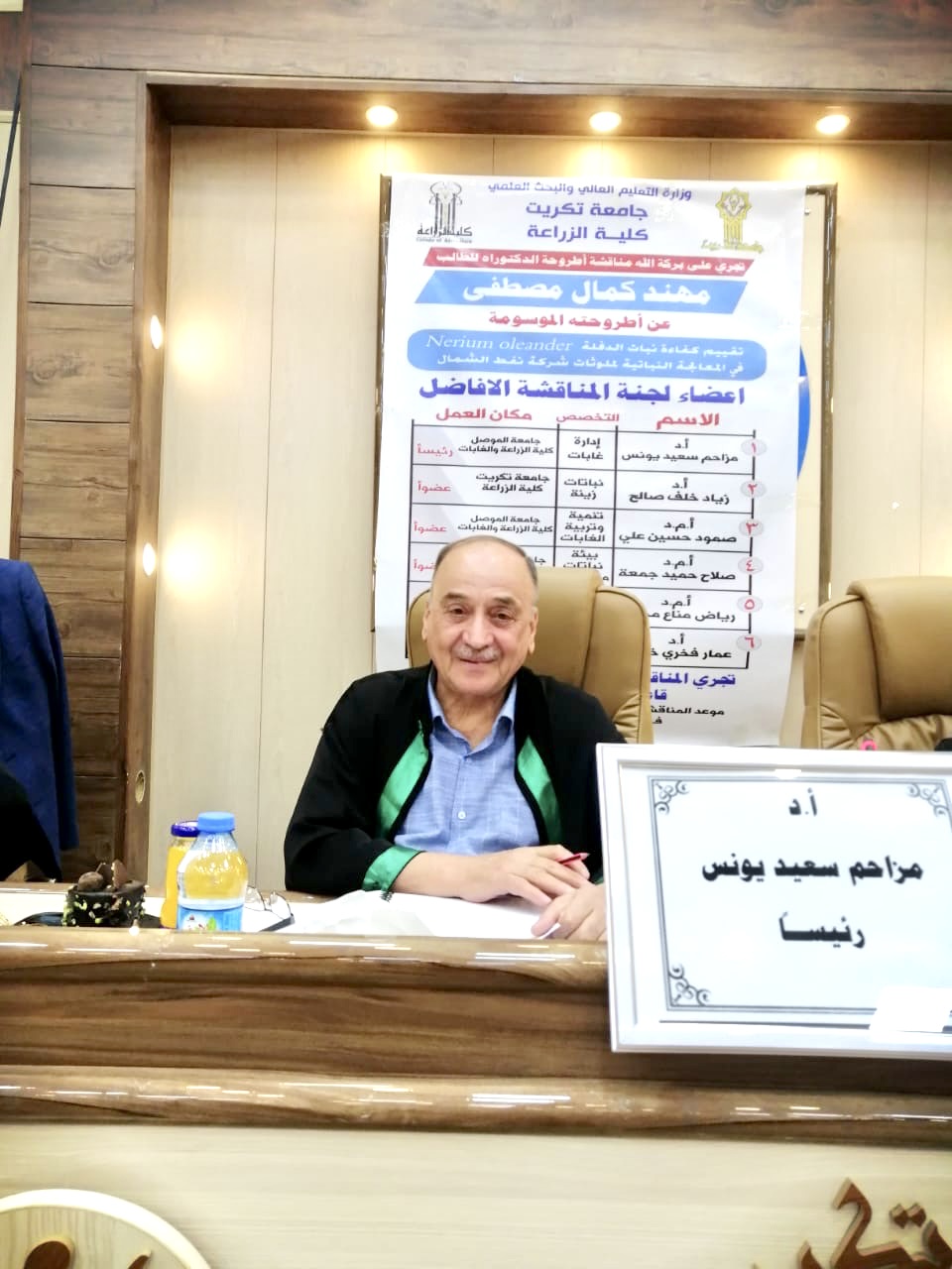 ضمن النشاطات العلمية لتدريسي كليتنا شارك كل من الاستاذ الدكتور مزاحم سعيد البك(رئيساً) والدكتورة صمود حسين علي(عضواً) التدريسيان في قسم علوم الغابات في كليتنا في لجنة مناقشة أطروحة دكتوراه للباحث مهند كمال مصطفى في قسم البستنة وهندسة الحدائق في كلية الزراعة /جامعة تكريت عن أطروحته الموسومة ” تقييم كفاءة نبات الدفلة في المعالجة النباتية لملوثات شركة نفط الشمال ) .