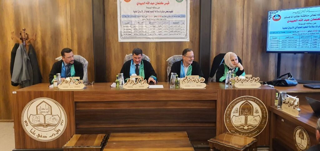 ضمن النشاطات العلمية لتدريسي كليتنا شارك كل من الأستاذ الدكتورة سمية خلف بدوي والدكتور طه محمد تقي التدريسيان في قسم علوم الأغذية في كليتنا في مناقشة اطروحة الدكتوراه الموسومة (التأثيرات الفسلجية لبكتريا حامض اللاكتيك والسلينيوم النانوي على السمية المحدثة لرابع خلات الرصاص في ذكور الجرذان البالغة) للباحث في قسم علوم الأغذية في كلية الزراعة جامعة تكريت (ياسين حسن عليوي).
