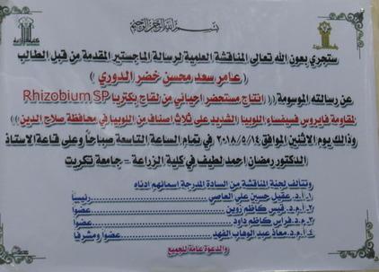 ضمن النشاطات العلمية لتدريسي كلية الزراعة والغابات شارك الدكتور فراس كاظم الجبوري معاون العميد للشؤون الإدارية والتدريسي في قسم وقاية النبات في مناقشة رسالة الماجستير للطالب عامر سعد محسن خضر الدوري في قسم وقاية النبات / كلية الزراعة / جامعة تكريت لرسالته الموسومة (انتاج مستحضر احيائي من لقاح بكترياRhizobium SP لمقاومة فايروس فسيفساء اللوبيا الشديد على ثلاث اصناف من اللوبيا في محافظة صلاح الدين) حيث ناقشت الرسالة كيفية تكوين وإنتاج مركب (مستحضر) احيائي من لقاح بكتيري لغرض مكافحة مرض فسيفساء اللوبيا والذي يعد منتشراً بكثرة في الوقت الحالي.