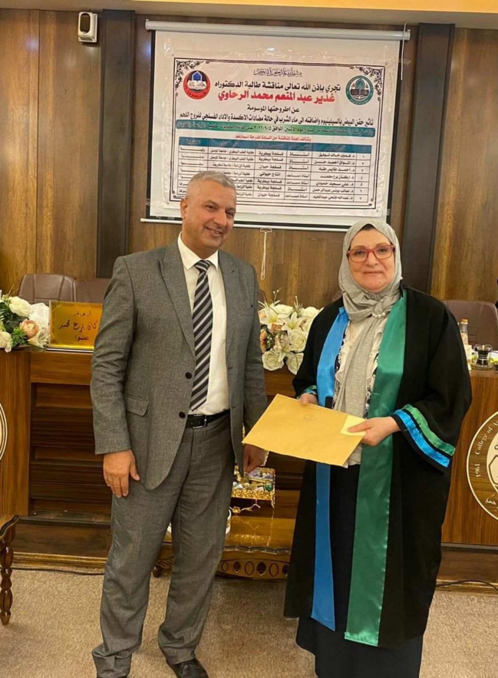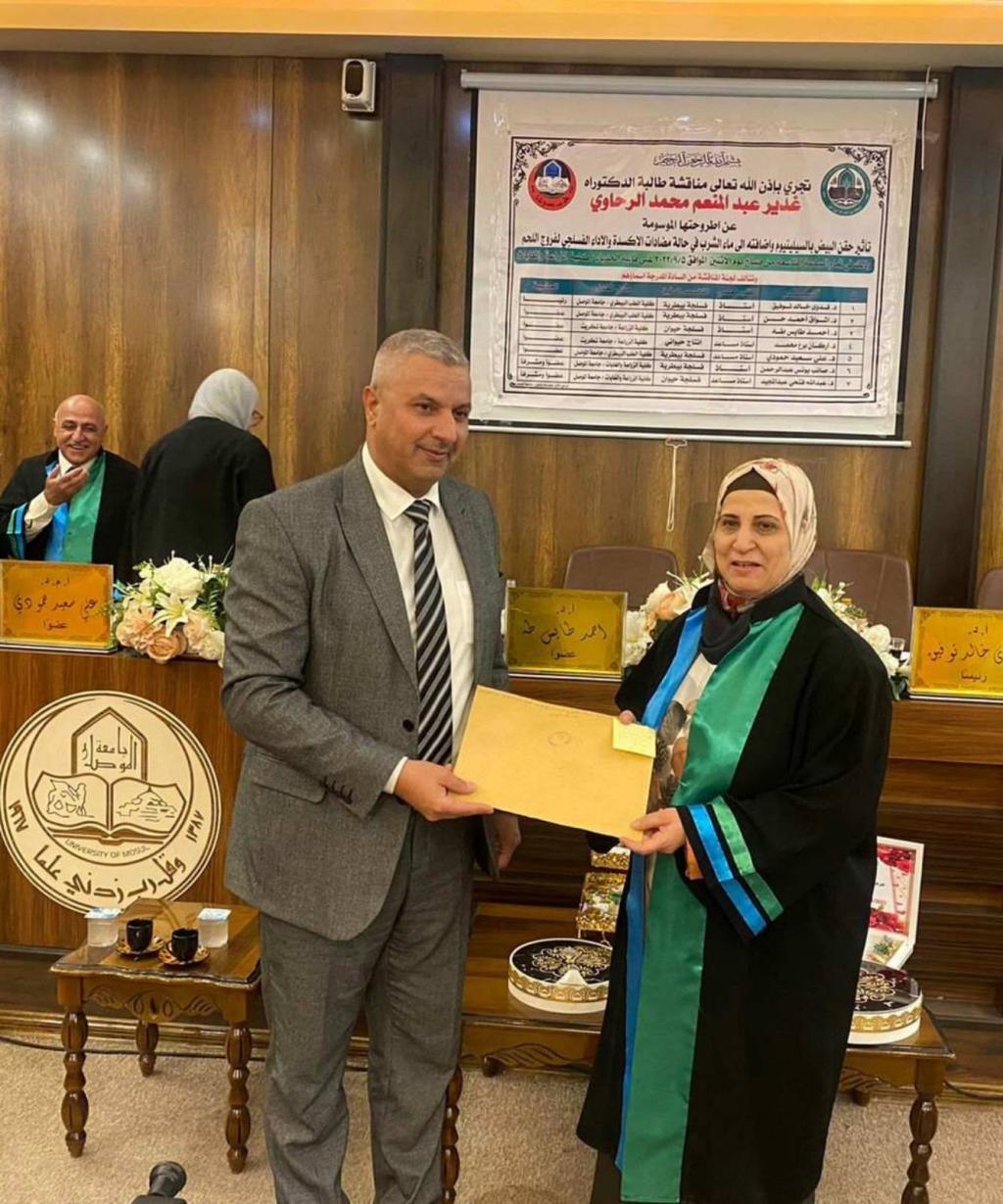 هذا وترأس لجنة المناقشة الأستاذ الدكتورة فدوى خالد توفيق وعضوية كل من الأستاذ الدكتورة اشواق احمد حسن والأستاذ الدكتور أحمد طايس طه والدكتور اركان برع محمد والدكتور علي سعيد حمودي وبإشراف كل من الأستاذ الدكتور صائب يونس عبد الرحمن والدكتور عبدالله فتحي عبدالمجيد.