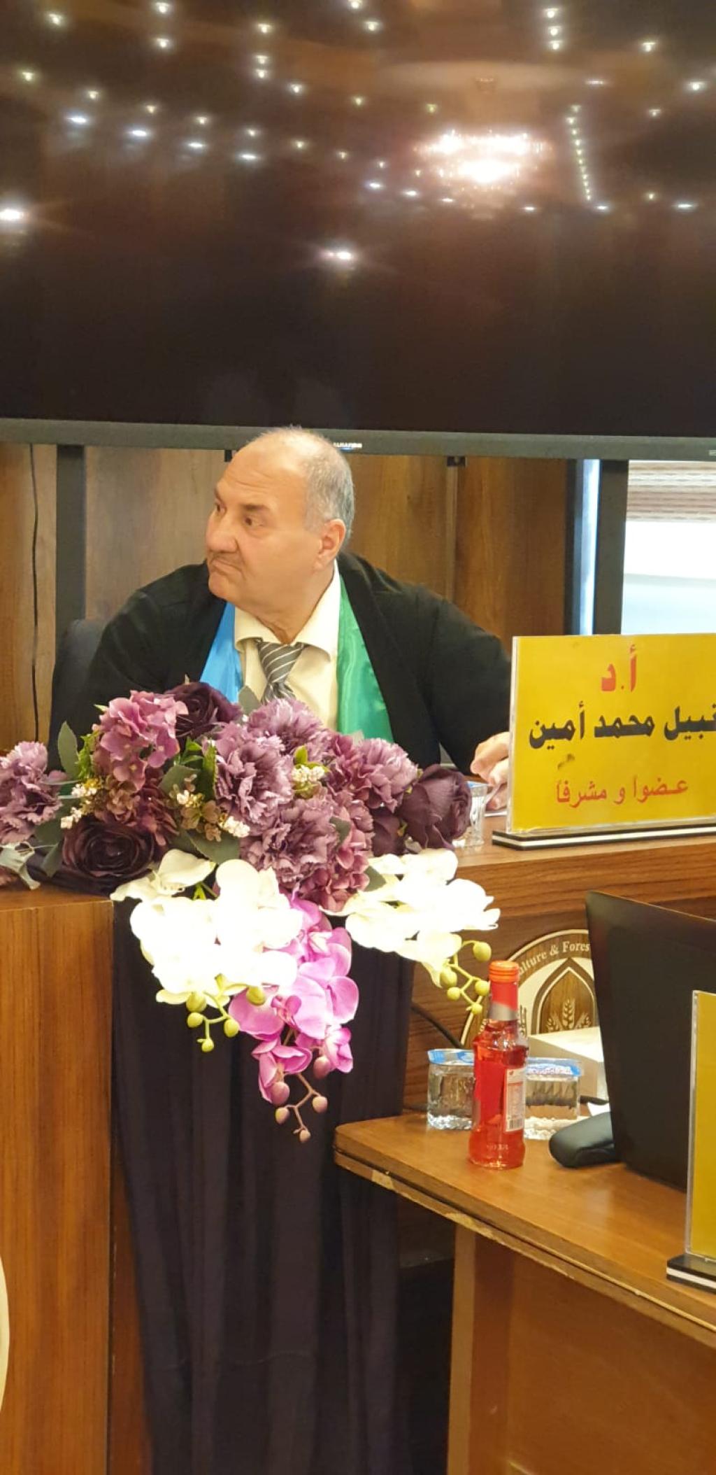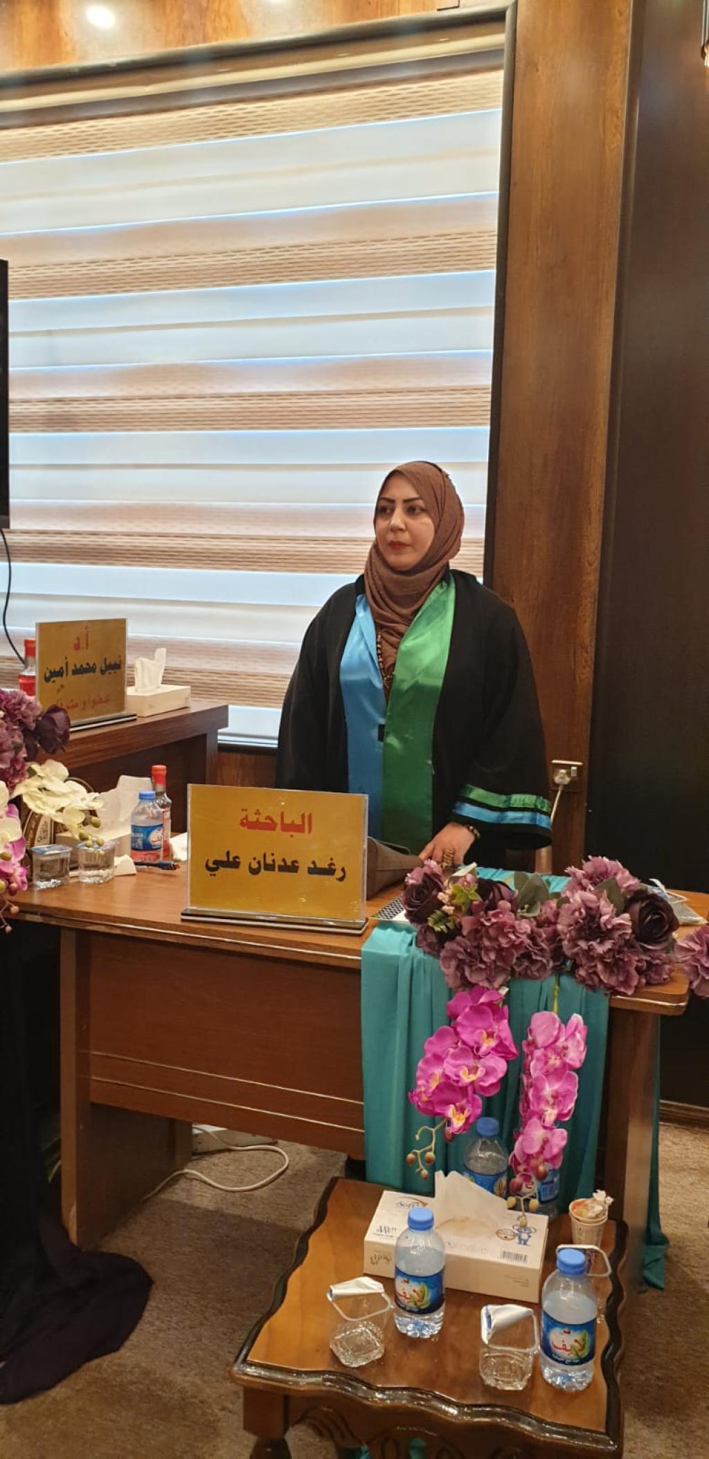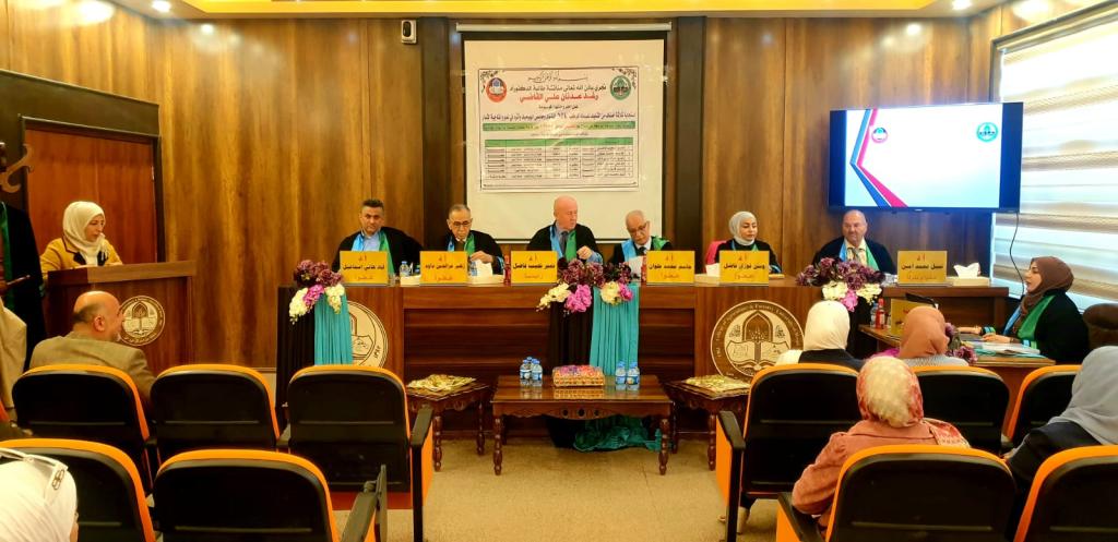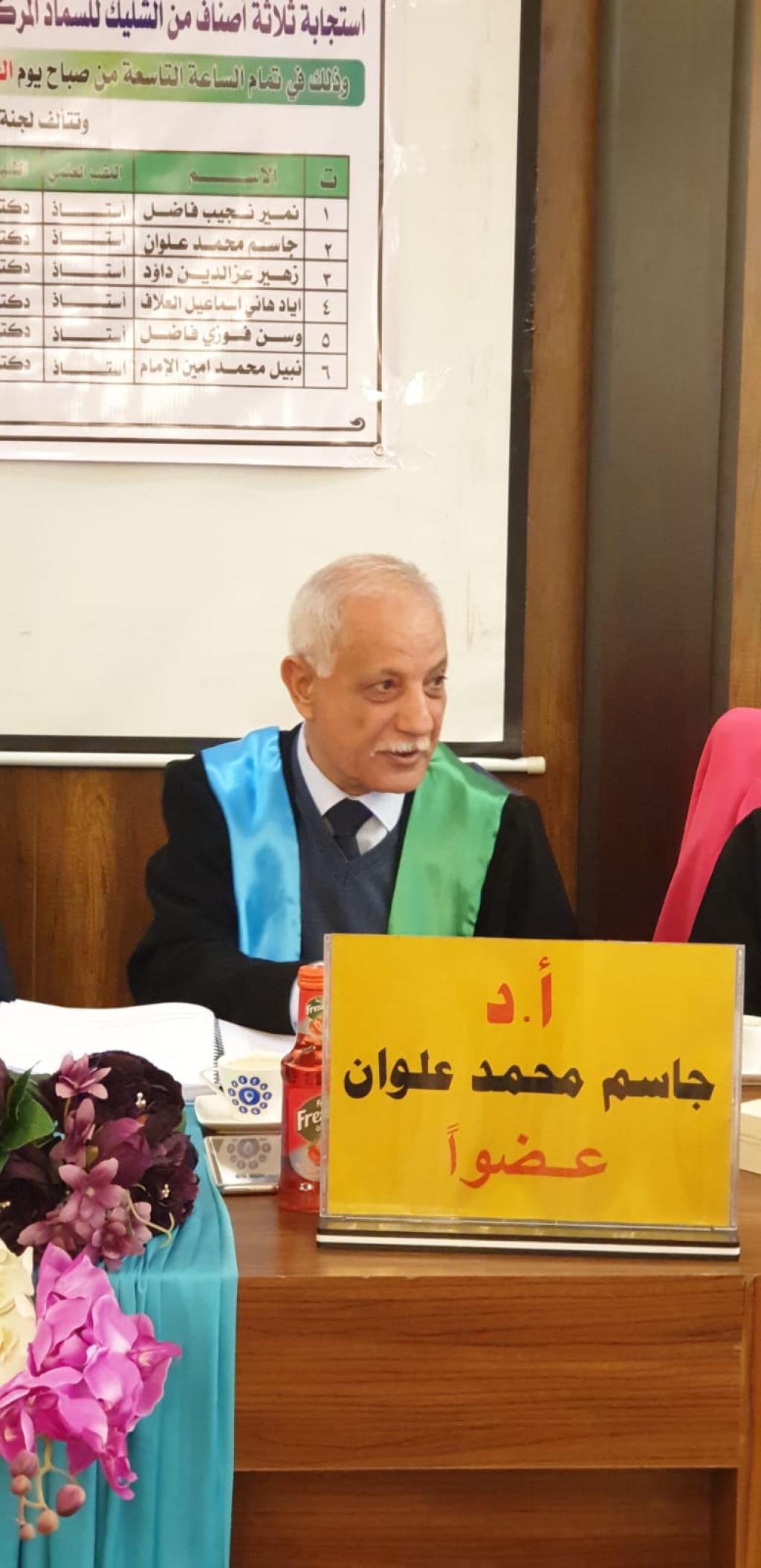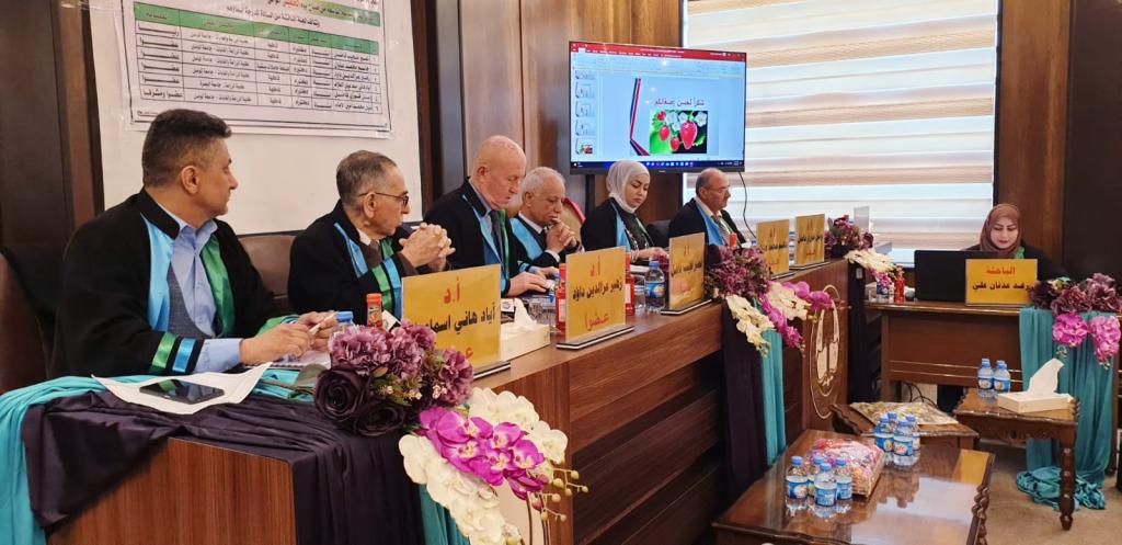 وقد ترأس لجنة المناقشة الأستاذ الدكتور نمير نجيب فاضل وعضوية كلٌّ من الأستاذ الدكتور جاسم محمد علوان والأستاذ الدكتور زهير عز الدين داؤد والاستاذ الدكتور أياد هاني العلاف والأستاذ الدكتورة وسن فوزي فاضل وبإشراف الأستاذ الدكتور نبيل محمد امين الامام .