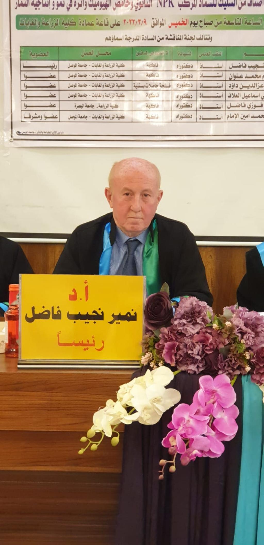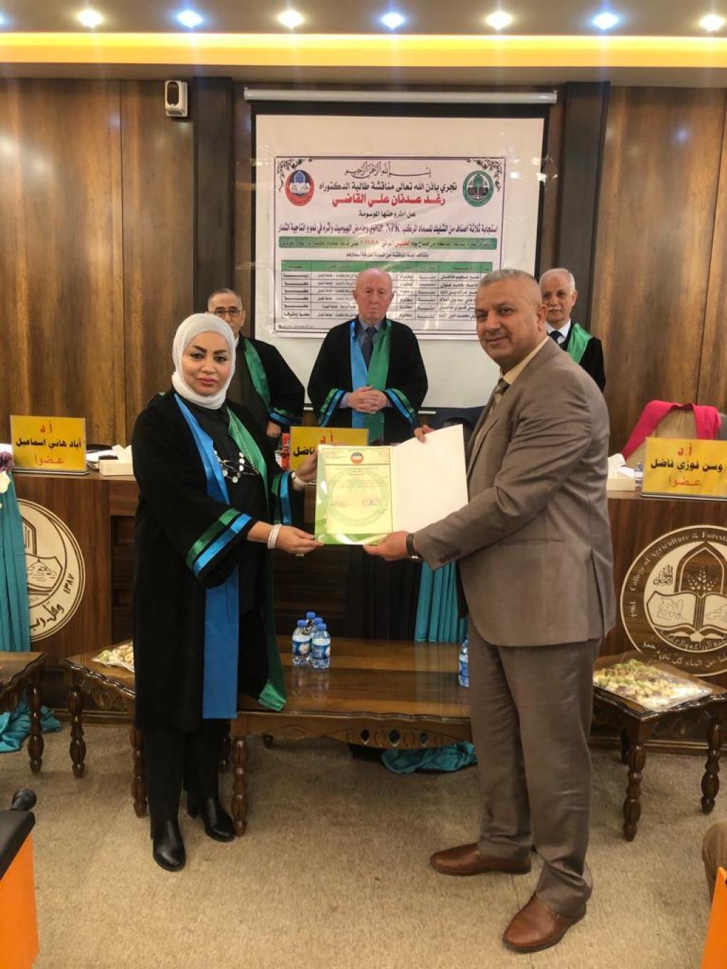 بحضور السيد عميد الكلية الاستاذ الدكتور محمد يونس العلاف ومعاونه للشؤون الادارية نوقشت صباح اليوم وعلى قاعة عمادة الكلية أطروحة دكتوراه في قسم البستنة وهندسة الحدائق في كليتنا والتي تقدمت بها الطالبة رغد عدنان علي والموسومة (استجابة ثلاثة أصناف من الشليك للسماد المركب النانوي وحامض الهيوميك وأثره في نمو وإنتاجية الثمار).