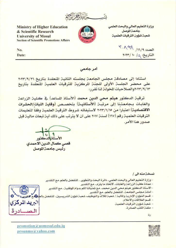 تهنئة لتدريسي بمناسبة ترقيته العلمية.