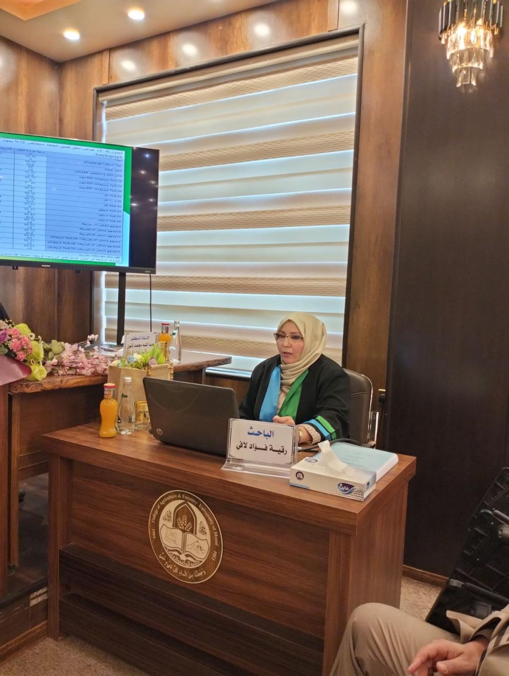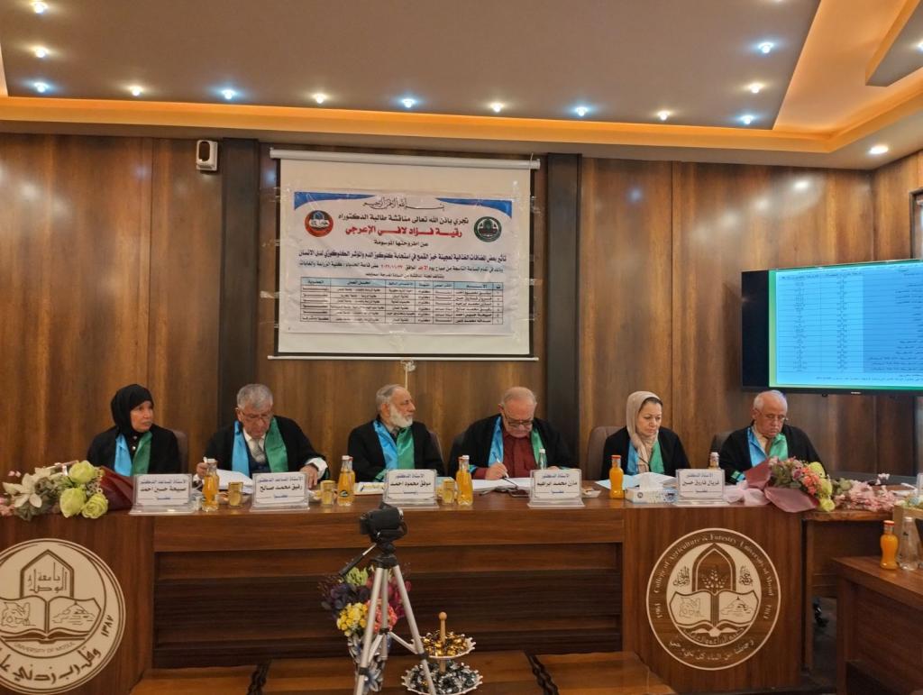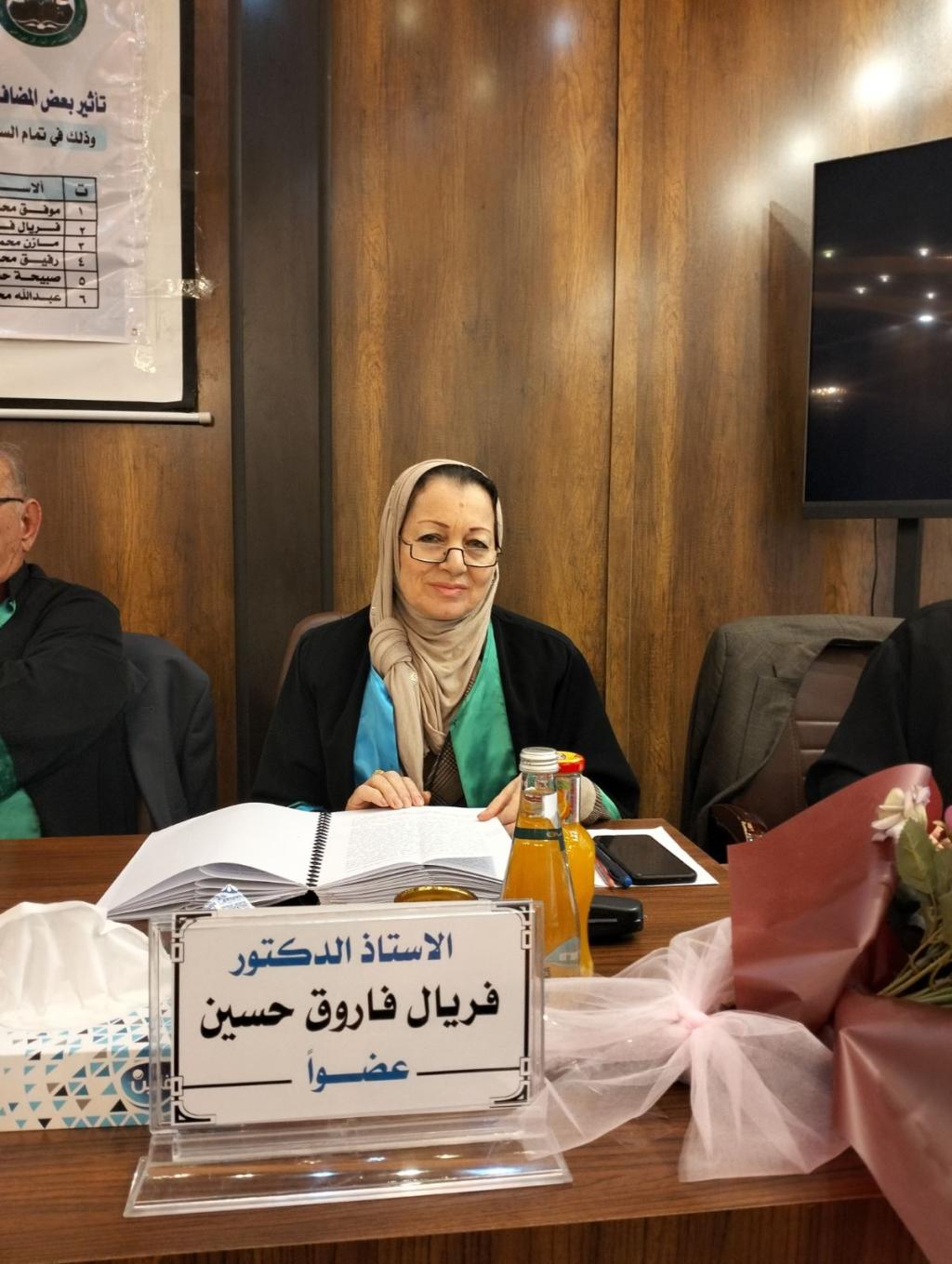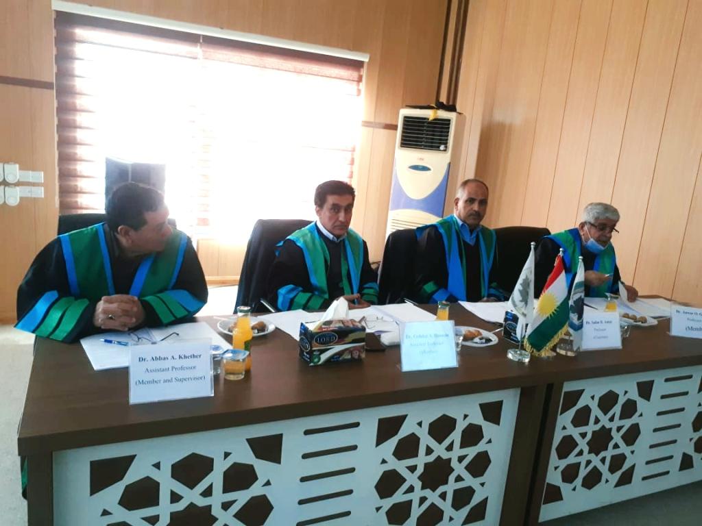 وترأس لجنة المناقشة الاستاذ الدكتور موفق محمود أحمد وعضوية الاستاذ الدكتورة فريال فاروق حسين والاستاذ الدكتور مازن محمد إبراهيم والدكتور رفيق محمد صالح والدكتورة صبيحة حسين احمد وبإشراف الاستاذ الدكتور عبدالله محمد ذنون.