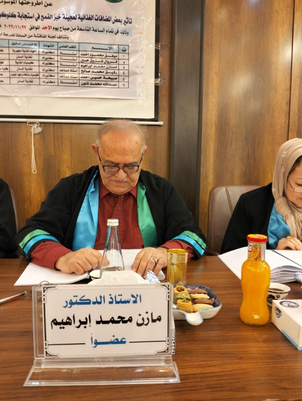 بحضور السيد مساعد رئيس الجامعة للشؤون العلمية الاستاذ الدكتور منير البدراني والسيد عميد الكلية الاستاذ الدكتور محمد يونس العلاف ومعاونيه للشؤون العلمية والإدارية نوقشت صباح اليوم وعلى قاعة عمادة كليتنا أطروحة دكتوراه في قسم علوم الاغذية والتي تقدمت بها الطالبة رقية فؤاد لافي والموسومة (تأثير بعض المضافات الغذائية لعجينة خبز القمح في استجابة كلوكوز الدم والمؤشر الكلوكوزي لدى الإنسان) .