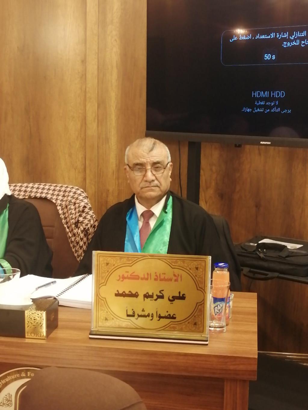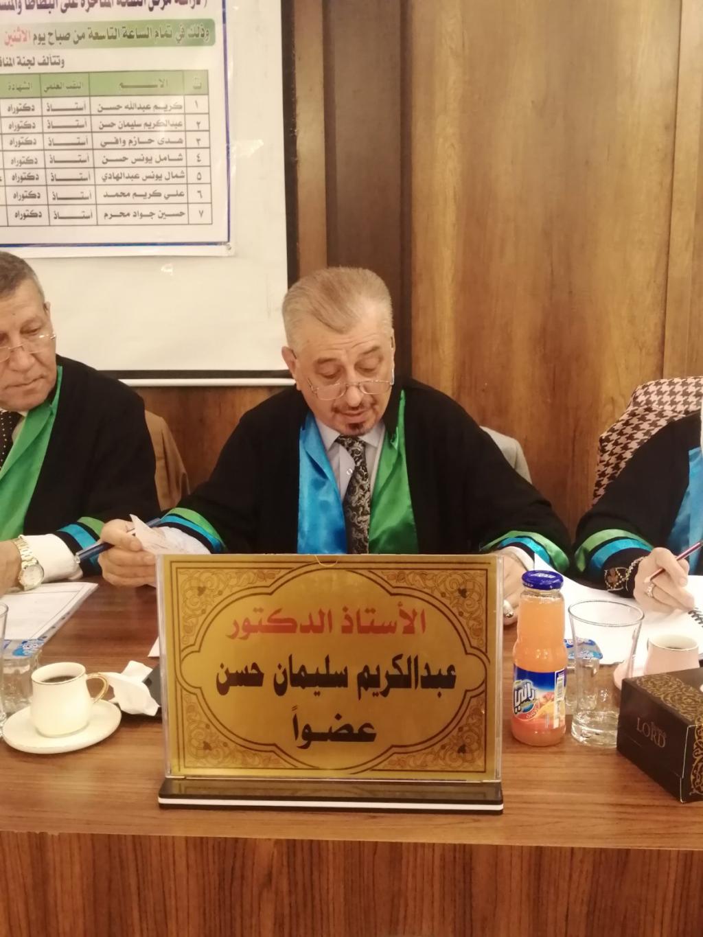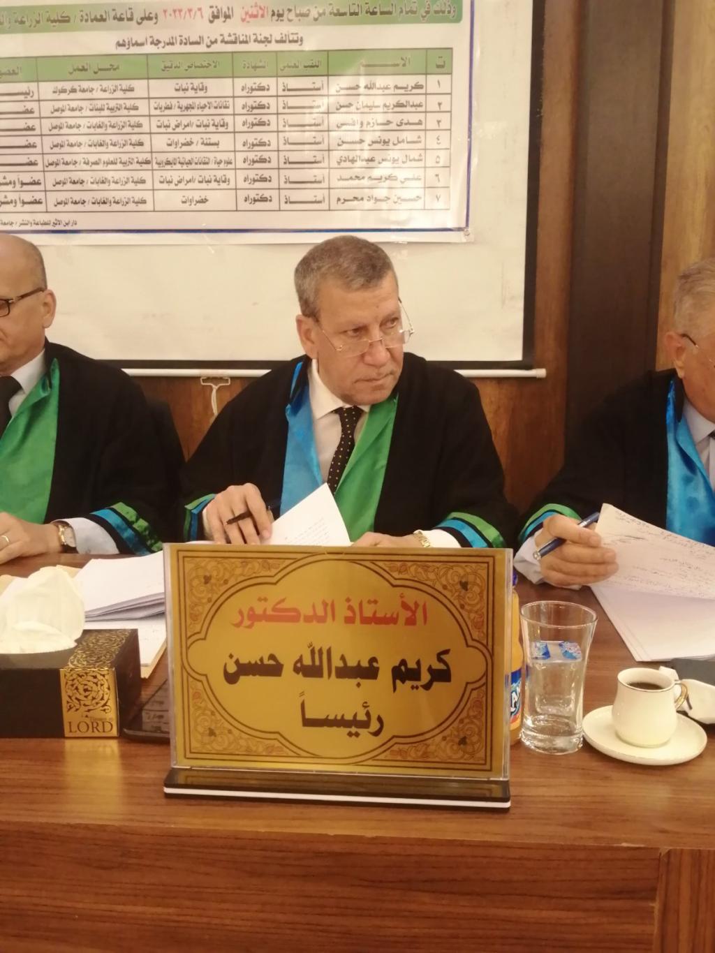وقد ترأس لجنة المناقشة الأستاذ الدكتور كريم عبدالله حسن وعضوية كل من الأستاذ الدكتور عبدالكريم سليمان حسن والأستاذ الدكتورة هدى حازم وافي والأستاذ الدكتور شامل يونس حسن والأستاذ الدكتورة شمال يونس عبدالهادي وبإشراف كل من الأستاذ الدكتور علي كريم محمد والأستاذ الدكتور حسين جواد محرم.