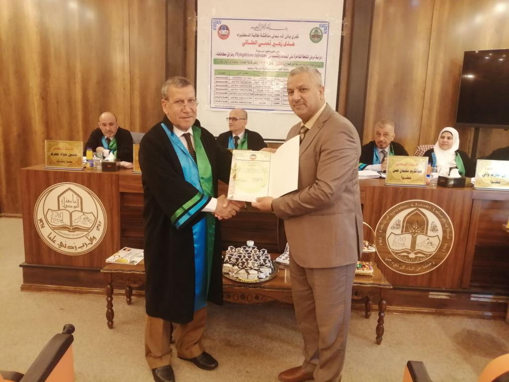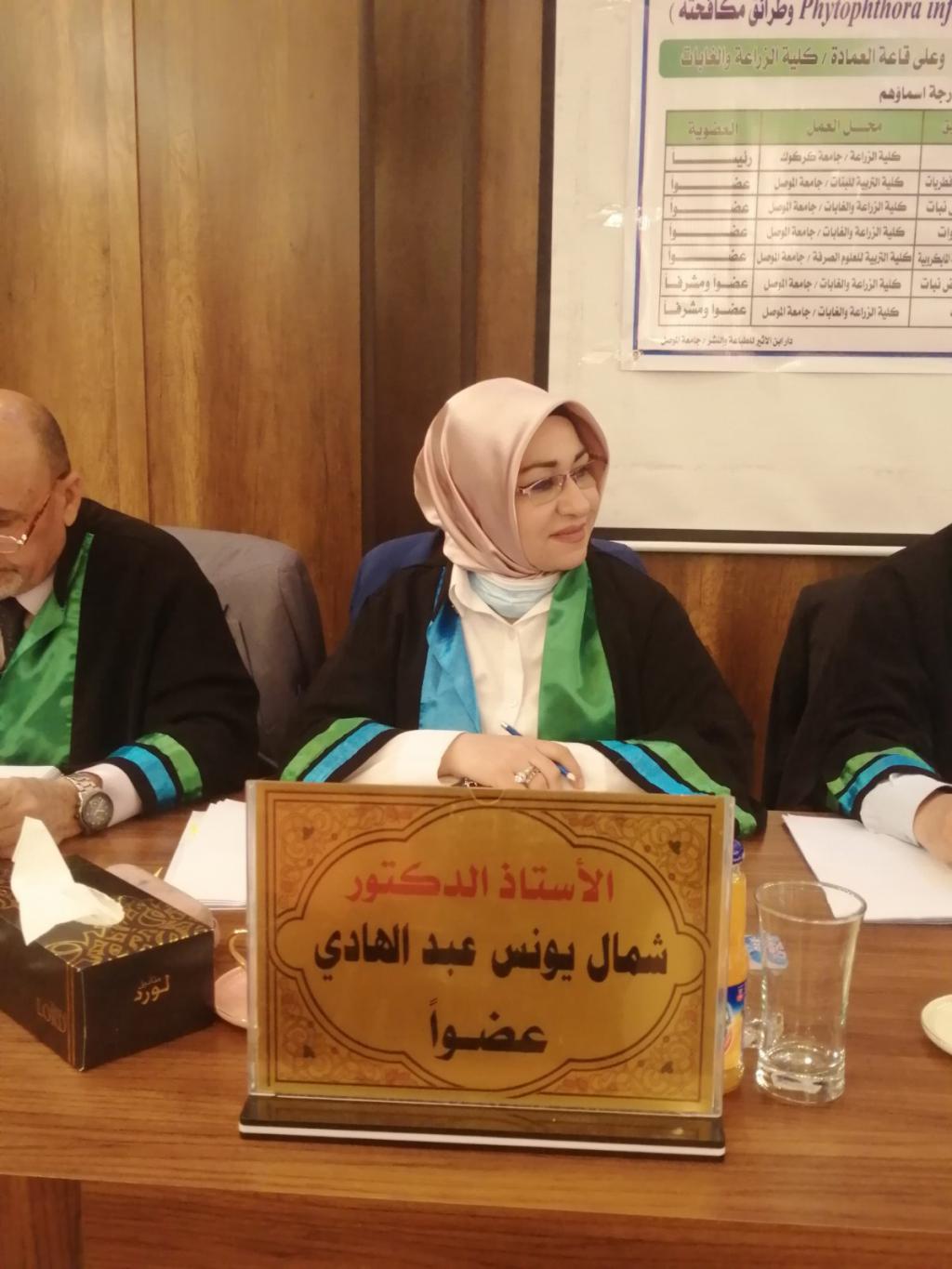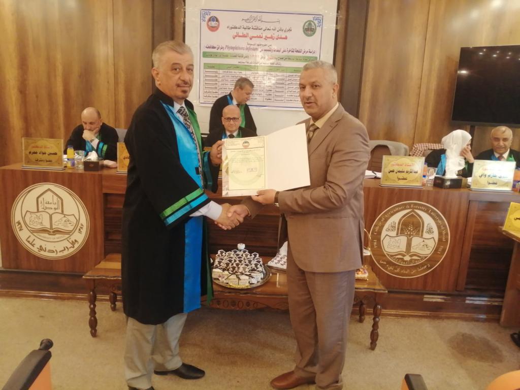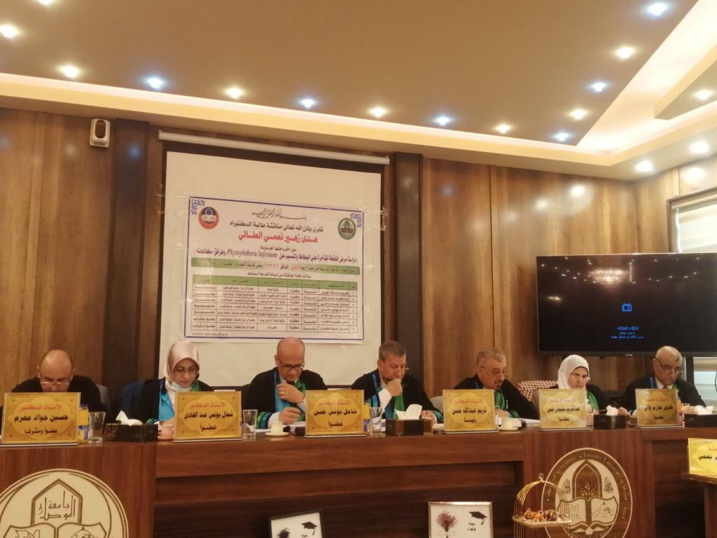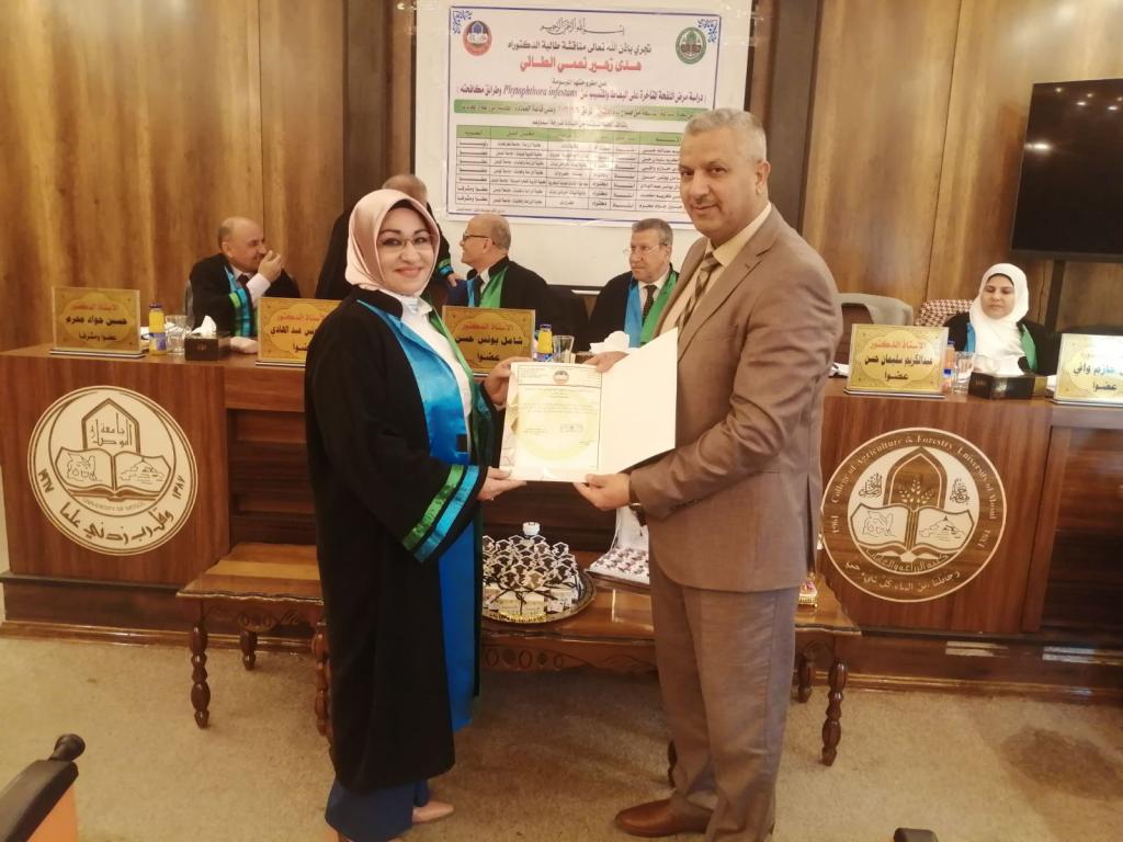 بحضور السيد عميد الكلية الاستاذ الدكتور محمد يونس العلاف نوقشت صباح اليوم وعلى قاعة عمادة الكلية أطروحة دكتوراه في قسم وقاية النبات والتي تقدمت بها الطالبة هدى زهير الطائي والموسومة (دراسة مرض اللفحة المتأخرة على البطاطا المتسبب عن Phytophthora infestans وطرائق مكافحته ).
