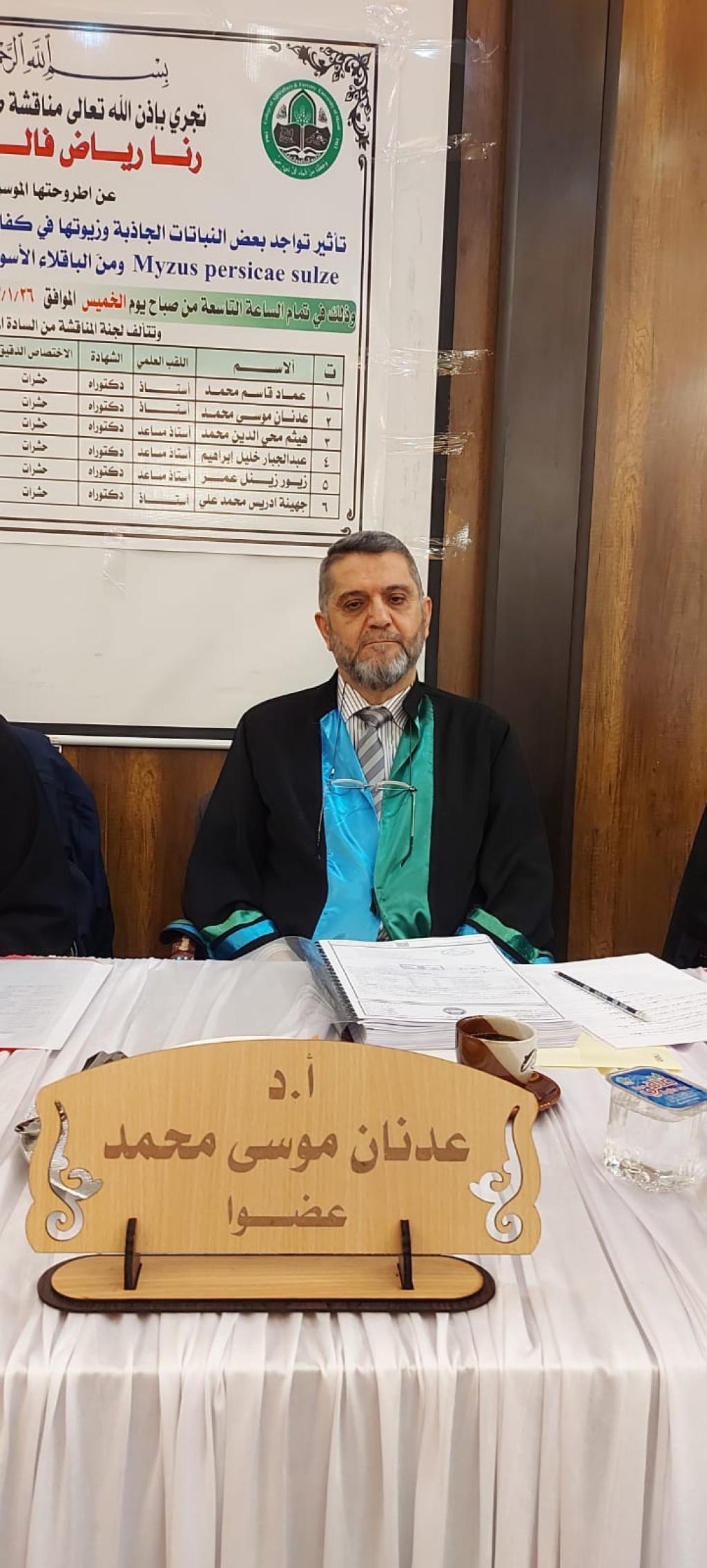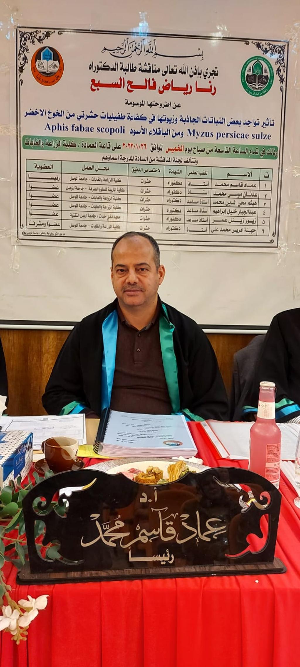 نوقشت اليوم وعلى قاعة عمادة الكلية اطروحة دكتوراه في قسم وقاية النبات والتي تقدمت بها الطالبة رنا رياض فالح السبع والموسومة (تأثير تواجد بعض النباتات الجاذبة وزيوتها في كفاءة طفيليات حشرتي مَنّ الخوخ الأخضر Myzus persicae sulze ومَنّ الباقلاء الأسود Aphis fabae scopoli) حضر جانب منها السيد عميد الكلية الاستاذ الدكتور محمد يونس العلاف.