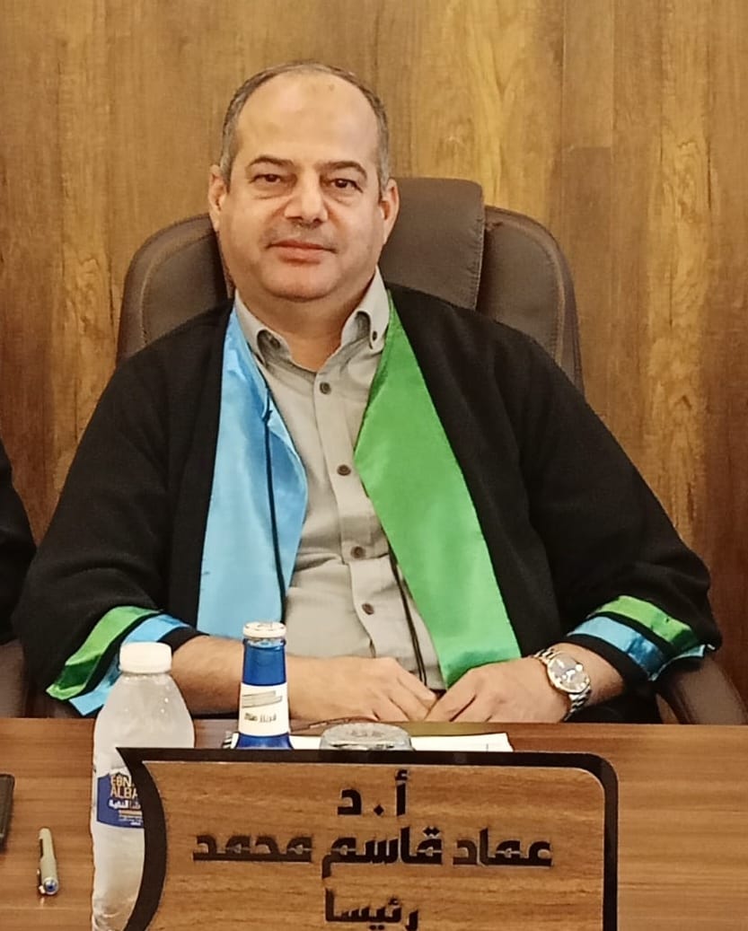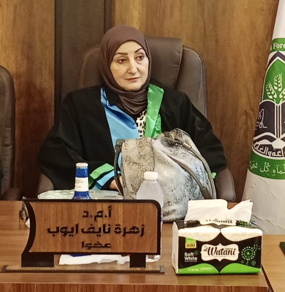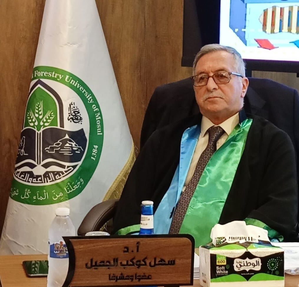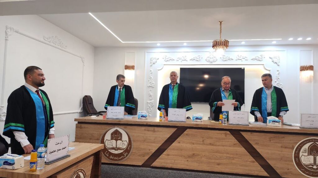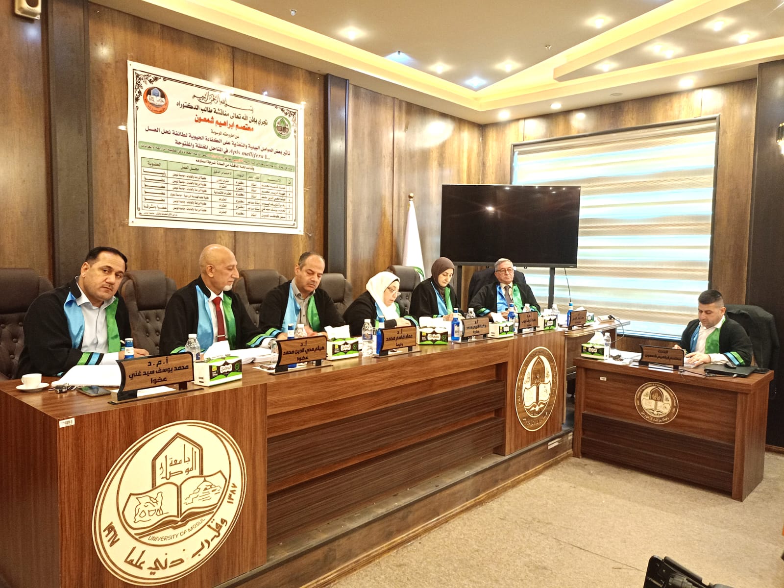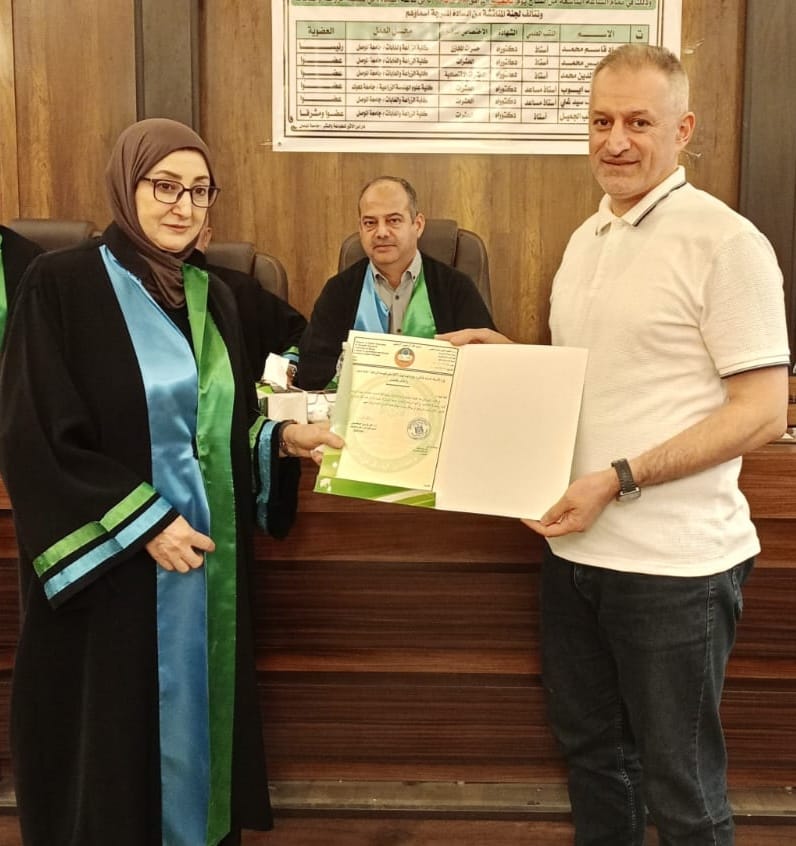 وقد ترأس لجنة المناقشة الاستاذ الدكتور عماد قاسم محمد وعضوية كلٌّ من الاستاذ الدكتورة جهينة ادريس محمد والاستاذ الدكتور هيثم محي الدين محمد والدكتورة زهرة نايف أيوب والدكتور محمد يوسف سيد غني واشراف الأستاذ الدكتور سهل كوكب الجميل.