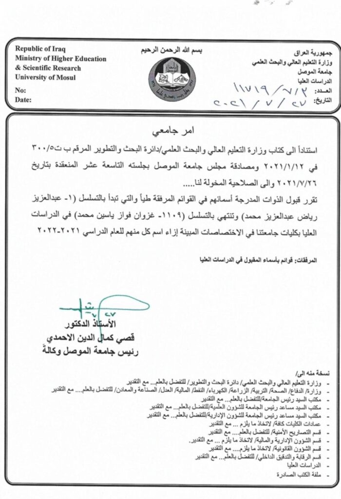 هذا وترأس لجنة المناقشة الاستاذ الدكتور مزهر كاظم كعيبر وعضوية الأستاذ الدكتور عماد غايب عبدالرحمن والدكتور ثائر رشيد محمد والدكتور خالد حساني سلطان والدكتور عبد الناصر ذنون وبأشراف الاستاذ الدكتور عارف قاسم حسن.