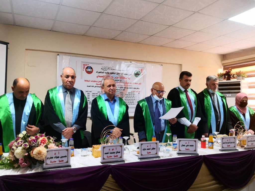 هذا وترأس لجنة المناقشة الأستاذ الدكتور محمد علي جمال وعضوية الأستاذ الدكتور مظفر أحمد الموصلي والأستاذ الدكتور عبدالمنعم سعدالله خليل العبيدي والأستاذ الدكتور حارث برهان الدين عبدالرحمن والدكتورة وحيدة علي أحمد البدراني وبأشراف الدكتور صالح محمد أحمد الراشدي والأستاذ الدكتور حسين جواد محرم البياتي.