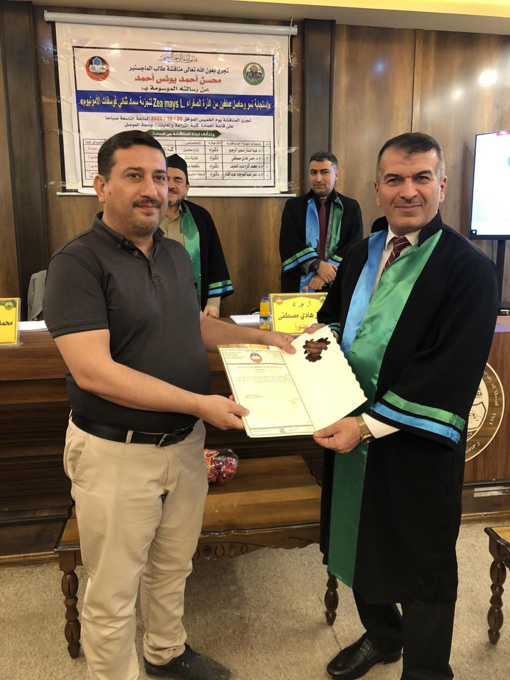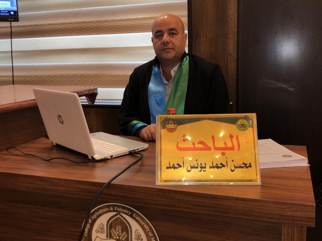 نوقشت صباح اليوم وعلى قاعة عمادة الكلية رسالة الماجستير في قسم المحاصيل الحقلية والتي تقدم بها الطالب محسن احمد يونس والموسومة