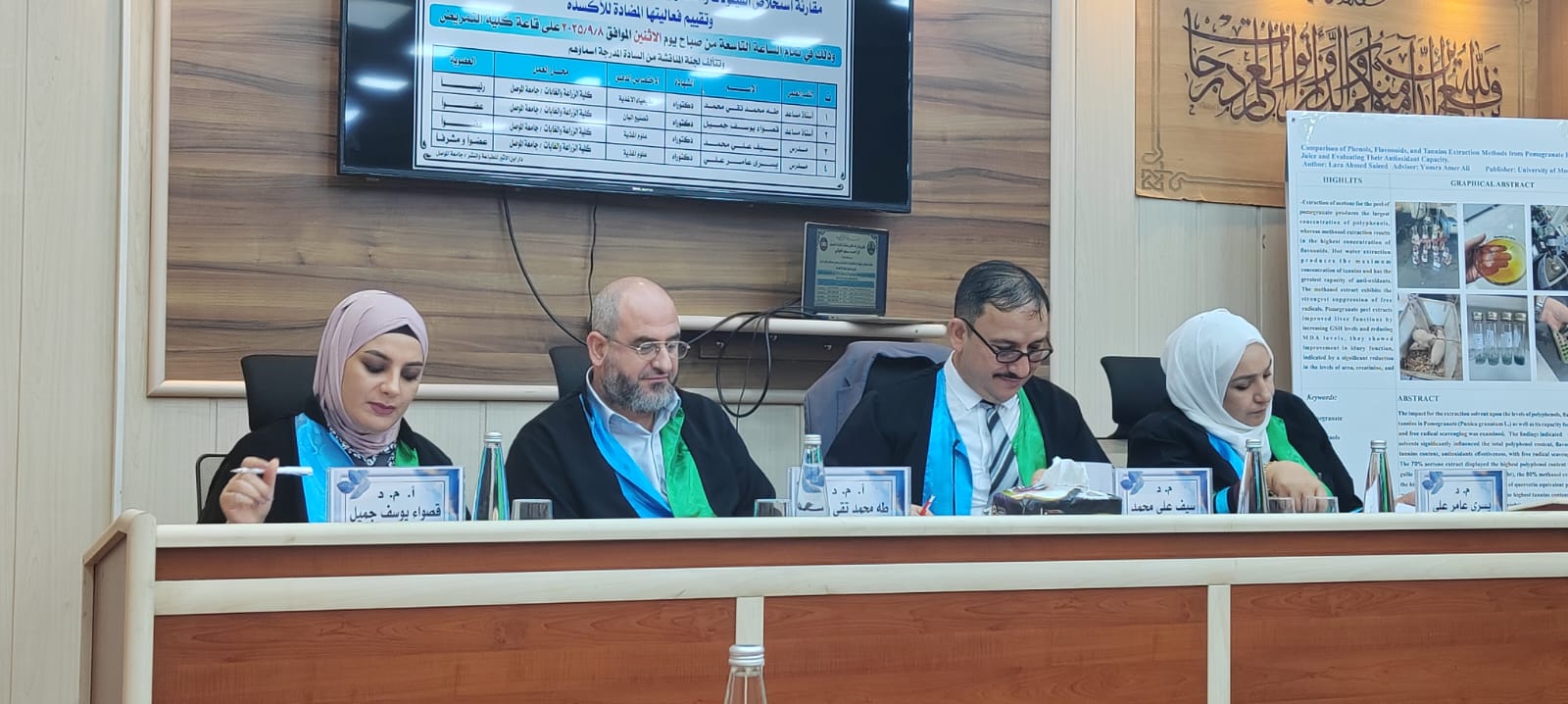 نوقشت في قسم علوم الأغذية في كلية الزراعة والغابات بجامعة الموصل رسالة الماجستير الموسومة (مقارنة طرق استخلاص الفينولات و الفلافونيدات و التانينات من عصير و مستخلص قشور الرمان و تقييم فعاليتها المضادة للأكسدة) اليوم الاثنين الموافق ٨/ ٩ و التي تقدمت بها الطالبة (لارا احمد سعيد) . هدفت الدراسة الى مقارنة استخدام الميثانول والاسيتون والماء الحار لاستخلاص الفينولات والفلافونويدات و التانينات من قشور وعصير الرمان للأكسدة فضلا عن اختبار قدرة هذه المستخلصات في معالجة الاجهاد التأكسدي في الفئران. وقد ترأس لجنة المناقشة الأستاذ المساعد الدكتور طه محمد علي وعضوية الأستاذ المساعد الدكتورة قصواء يوسف جميل والمدرس الدكتور سيف علي الجبوري وبإشراف المدرس الدكتورة يسرى عامر علي.