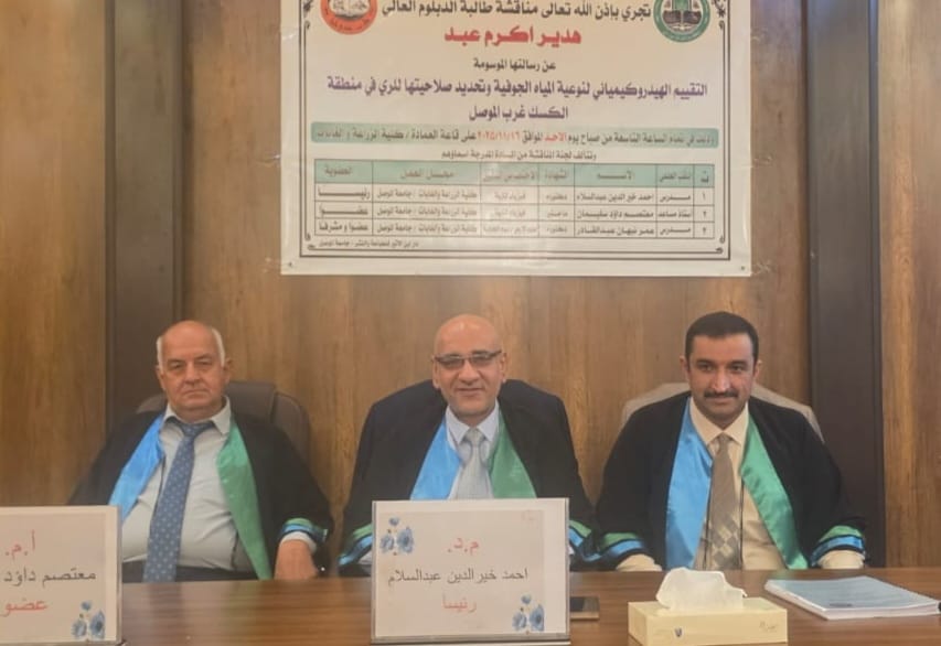 نوقشت في قسم علوم التربة والموارد المائية في كلية الزراعة والغابات بجامعة الموصل رسالة دبلوم عالي والموسومة (التقييم الهيدروكيميائي لنوعية المياه الجوفية وتحديد صلاحيتها للري في منطقة الكسك غرب الموصل ) اليوم الأحد الموافق (١٦ /١١/ ٢٠٢٥) والتي تقدمت بها الطالبة ( هدير اكرم عبد )، وقد ترأس لجنة المناقشة المدرس الدكتور أحمد خيري الدين عبدالسلام وعضوية الاستاذ المساعد معتصم داؤد سليمان وإشراف المدرس الدكتور عمر نبهان عبدالقادر.