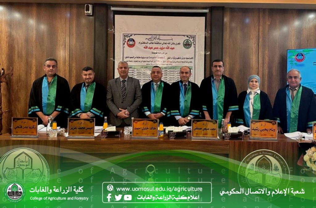 ناقش قسم علوم التربة والموارد المائية في كلية الزراعة والغابات في جامعة الموصل رسالة دبلوم عالي عـن ( استجابة نبات الحنطة Triticum aestivum L للتسميد NPK النانوي الأرضي والورقي في تربة كلسية) اليوم الخميس الموافق 5 / 10 / 2023، حضر جانبا منها السيد عميد الكلية الاستاذ الدكتور محمد يونس العلاف وعدد من تدريسي الكلية.