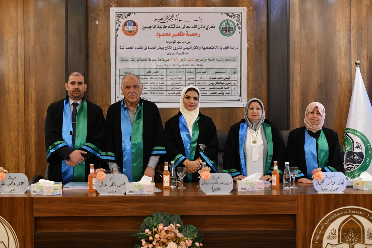 نوقشت في قسم الاقتصاد الزراعي في كلية الزراعة والغابات بجامعة الموصل رسالة الماجستير الموسومة (دراسة الجدوى الاقتصادية والأثر البيئي لمشروع انتاج بيض المائدة في قضاء الحمدانية – محافظة نينوى) اليوم الاحد الموافق (١/ ٦ /٢٠٢٥) حضر جانب منها السيد مساعد رئيس جامعة الموصل للشؤون العلمية الاستاذ الدكتور عبد الرحيم إبراهيم جاسم والسيد عميد الكلية الاستاذ الدكتور علي فاروق المعاضيدي و عدد من تدريسيي وطلبة كليتنا.
