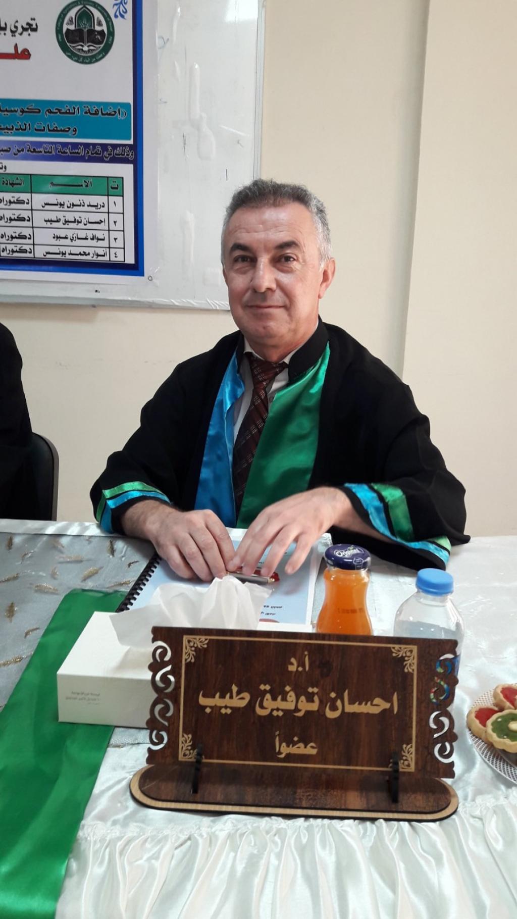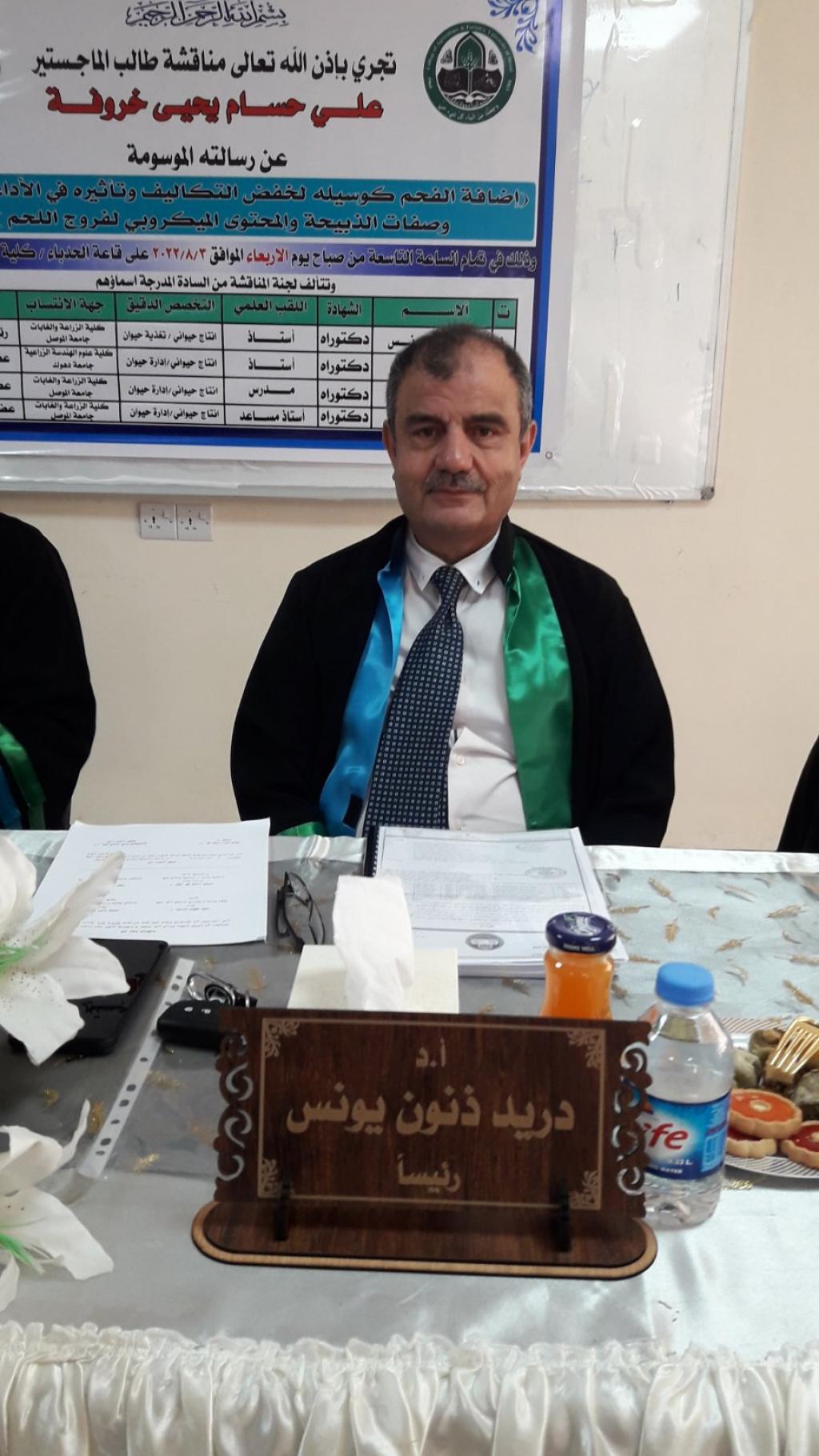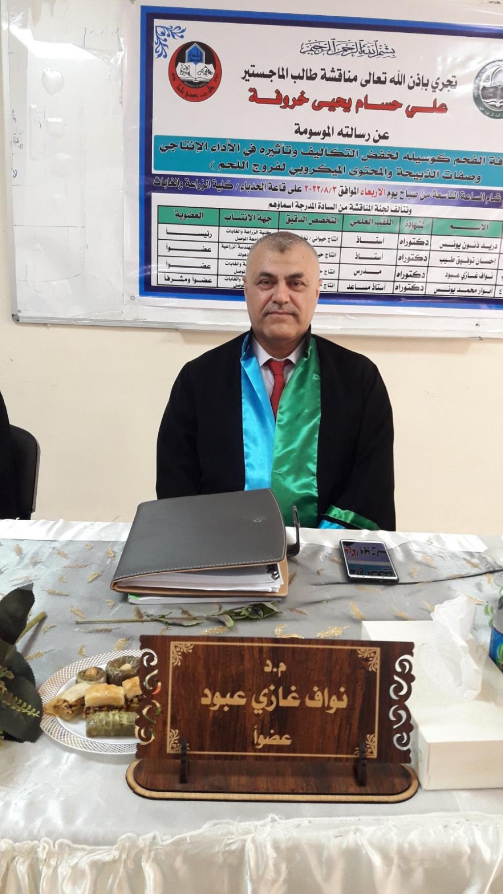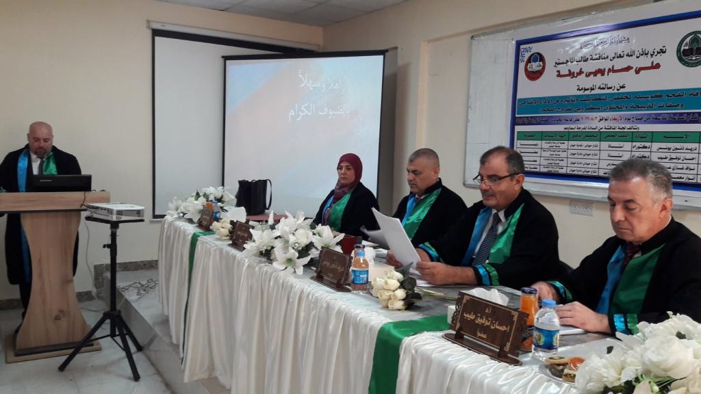 وقد ترأس لجنة المناقشة الأستاذ الدكتور دريد ذنون يونس وعضوية الأستاذ الدكتور إحسان توفيق طيب والدكتور نواف غازي عبود وباشراف الدكتورة انوار محمد يونس