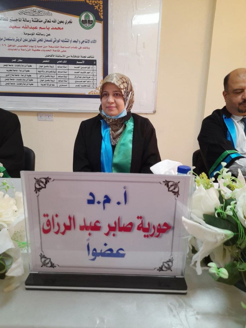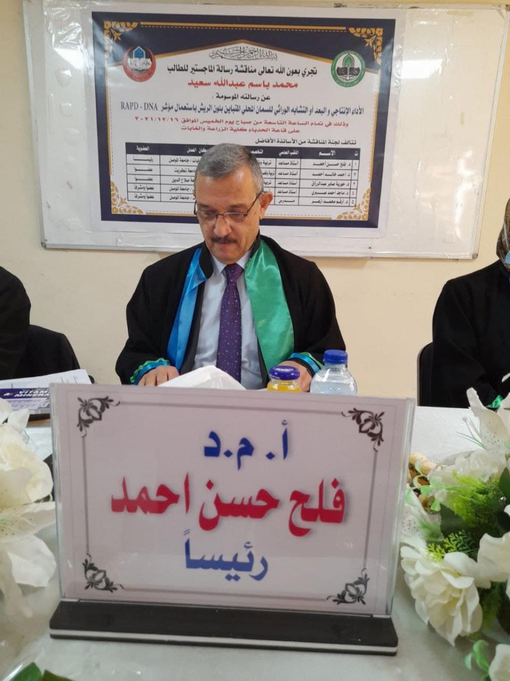 نوقشت صباح اليوم وعلى قاعة الحدباء في عمادة الكلية رسالة الماجستير في قسم الانتاج الحيواني والتي تقدم بها الطالب محمد باسم عبدالله سعيد والموسومة (الأداء الإنتاجي والبعد او التشابه الوراثي للسمان المحلي المتباين بلون الريش باستعمال مؤشر RAPD-DNA) حضر الاستاذ الدكتور محمد يونس العلاف عميد الكلية جانب من أجواء المناقشة.