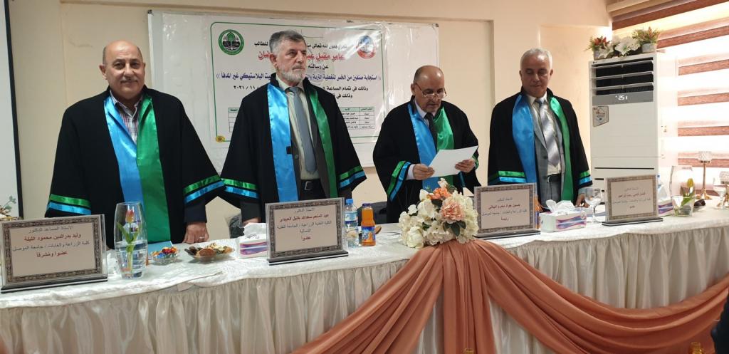 بحضور الأستاذ الدكتور محمد يونس العلاف عميد الكلية نوقشت وعلى قاعة الحدباء في عمادة الكلية رسالة الماجستير في قسم البستنة وهندسة الحدائق والتي تقدم بها الطالب عامر مقبل عبد الحميد والموسومة (استجابة صنفين من الخس لتغطية التربة والتسميد العضوي في البيت البلاستيكي غير المدفأ) ترأس لجنة المناقشة الأستاذ الدكتور حسين جواد محرم البياتي وعضوية الأستاذ الدكتور عبد المنعم سعدالله خليل والأستاذ الدكتور فاضل فتحي رجب وبأشراف الدكتور وليد بدر الدين الليله.