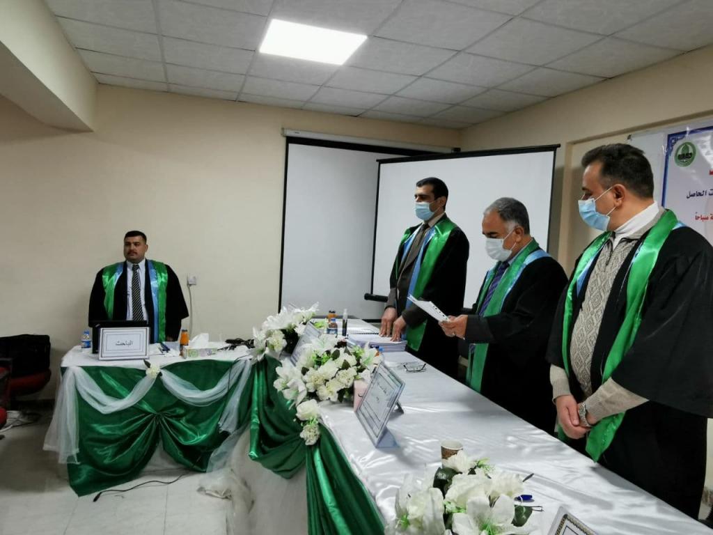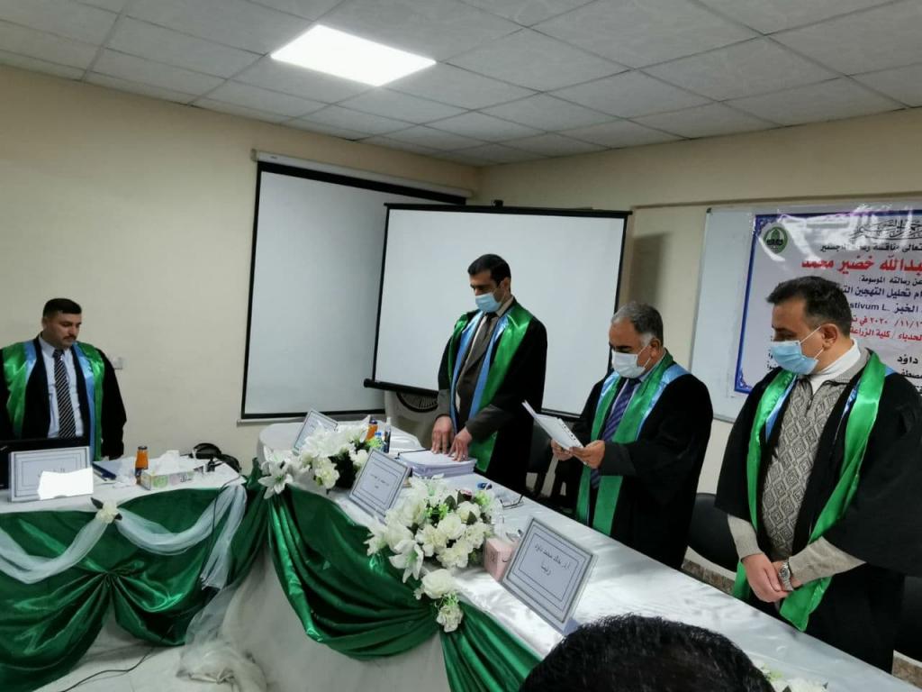 بحضور معاوني العميد للشؤون العلمية والادارية نوقشت صباح اليوم الاثنين2020/11/16 في قسم المحاصيل الحقلية رسالة الماجستير للطالب عبدالله خضير محمد الموسومة ( دراسة البيئة الوراثية باستخدام تحليل التهجين التبادلي لصفات الحاصل ومكوناته في حنطة الخبز Triticum aestivum L.) حيث تألفت لجنة المناقشة من الأستاذ الدكتور خالد محمد داود رئيساً والأستاذ المساعد الدكتور محمد إبراهيم مصطفى عضواً والمدرس الدكتور زكريا بدر فتحي عضواً والأستاذ المساعد الدكتور محمد صبحي مصطفى عضواً ومشرفاًوبعد اجراء المناقشة تم قبول الرسالة ومنح الطالب درجة الماجستير