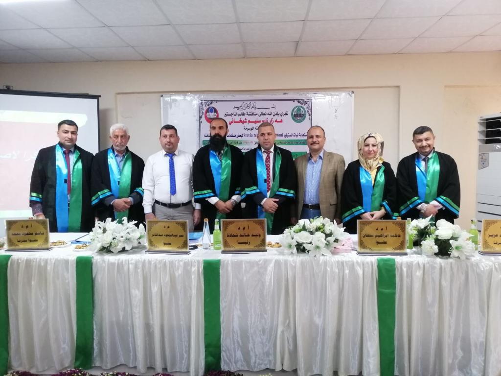 نوقشت صباح اليوم وعلى قاعة الحدباء في كليتنا رسالة الماجستير في قسم المحاصيل الحقلية والتي تقدم بها الطالب هه زار زاور سليم والموسومة ( استجابة نبات الستيفيا Stevia rebaudiana Bertoni لبعض منظمات النمو ومواعيد اضافته ) حضر جانب منها معاوني العميد للشؤون العلمية والإدارية.