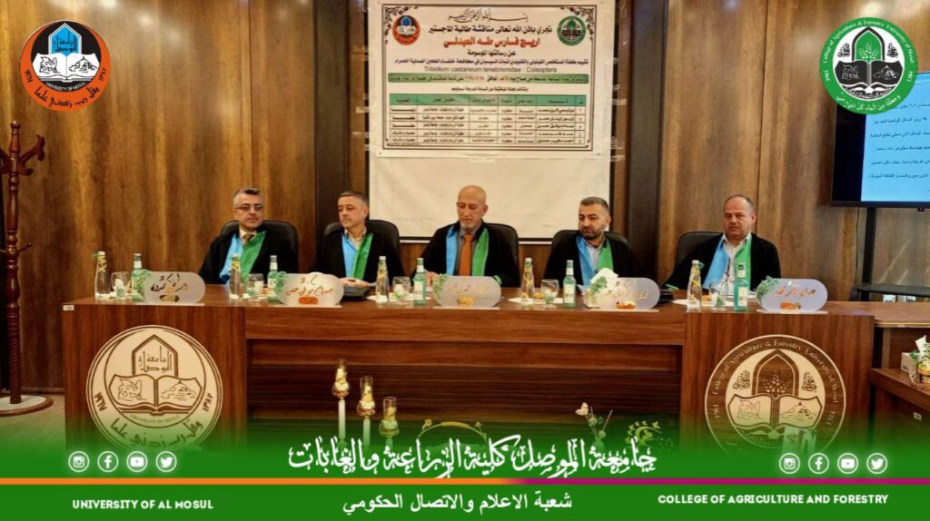 تناولت الرسالة التي تقدم بها الطالب ( نشوان عبدالله حسين الكاكي ) في قسم المحاصيل الحقلية دراسة تاثير اربعة تركيز من البورون النانوي المخلبي ( 0، 1، 2، 3 غم/لتر ) وتاثير ذلك في نمو وحاصل ونوعية ثلاثة اصناف من محصول زهرة الشمس ( ليفاثان، اقمار، بانام) .وتطرقت الى تقدير بعض المركبات الفعالة طبياً منها اوميكا-3 واوميكا-6 واوميكا-9، حيث وجد ان اضافة البورون النانوي ادى الى تحسين انتاجية محصول زهرة الشمس وكذلك نسبة الزيت وبعض المركبات الفعالة طبيا . وهدفت الدراسة الى معرفة افضل تركيز من البورون النانوي وتحديد الصنف الملائم من زهرة الشمس لإعطاء اعلى انتاجية، بالإضافة الى تقدير بعض المركبات الفعالة طبياً،ترأس لجنة المناقشة الدكتور ميسر محمد عزيز وعضوية كل من الدكتور حسام ممدوح حميد والدكتور ريان فاضل احمد وبإشراف وعضوية الدكتور وليد خالد شحاذة.
