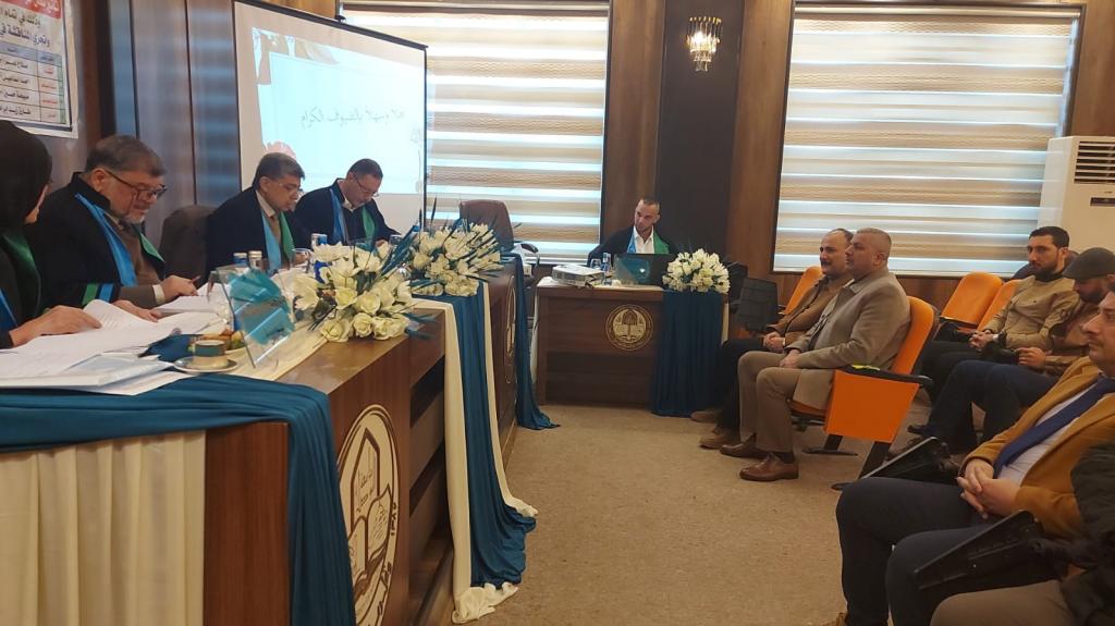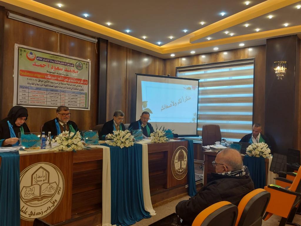 بحضور السيد عميد الكلية الأستاذ الدكتور محمد يونس العلاف ومعاونيه للشؤون العلمية والادارية نوقشت صباح اليوم رسالة الماجستير التي تقدم بها الطالب محمد سعود احمد والموسومة ( تأثير بعض المواد الطبيعية في تكوين الاغشية الحيوية لبكتريا Pseudomonas aerug inosa) هذا وترأس لجنة المناقشة الاستاذ الدكتور صلاح عمر احمد وعضوية الدكتور احمد اسماعيل احمد والدكتورة صبيحة حسين احمد وبأشراف الدكتور طارق زيد إبراهيم