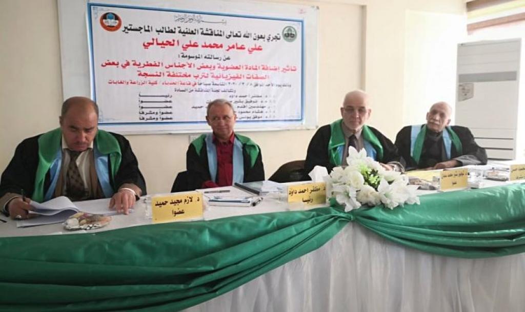 نوقشت صباح اليوم على قاعة الحدباء في كليتنا رسالة طالب الماجستير في قسم علوم التربة والموارد المائية علي عامر الحيالي في رسالته الموسومة (تأثير المادة العضوية وبعض الأجناس الفطرية في بعض الصفات الفيزيائية لترب مختلفة النسجة) وقد تالفت لجنة المناقشة من السادة