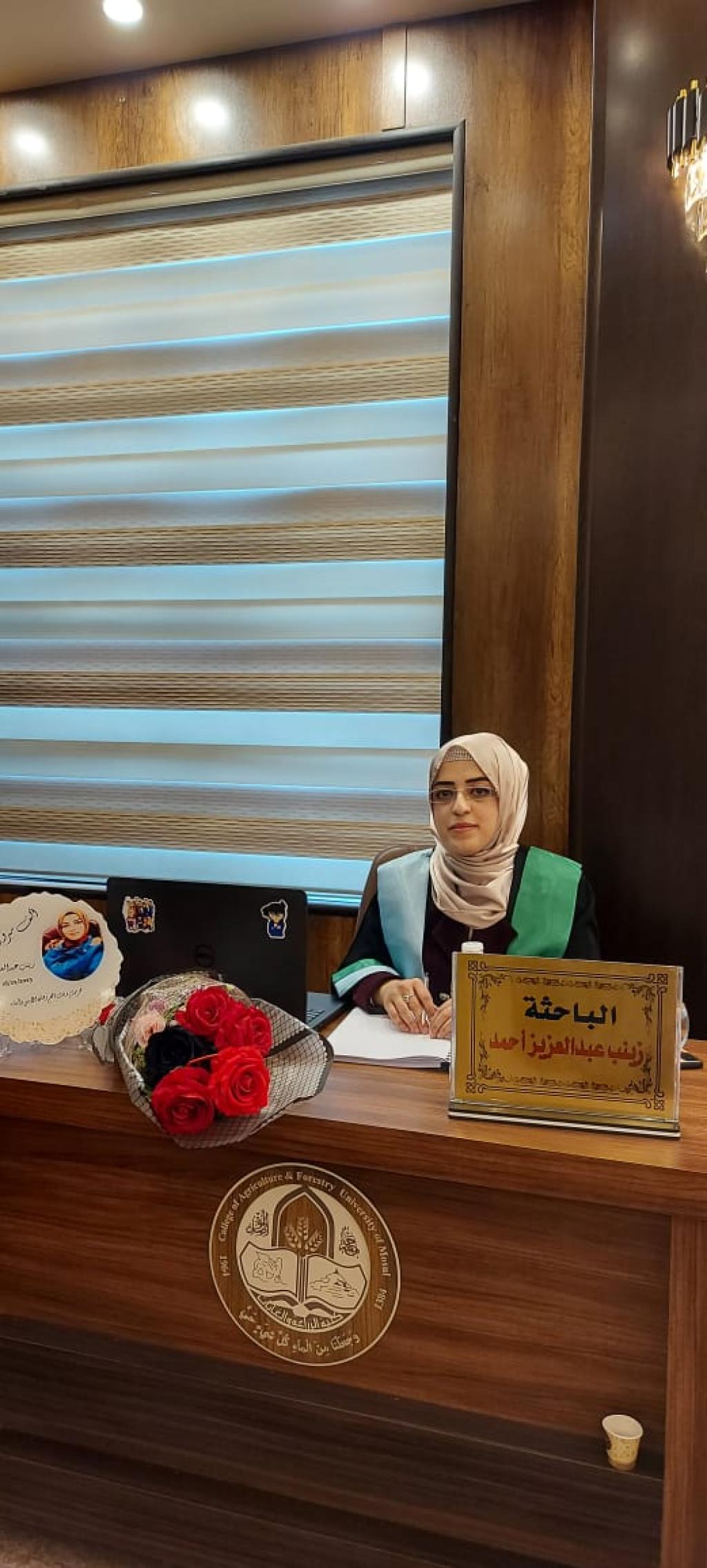 جرت صباح اليوم الأثنين وعلى قاعة عمادة كليتنا مناقشة رسالة طالبة الماجستير في قسم علوم التربة والموارد المائية زينب عبدالعزيز أحمد في رسالتها المرسومة ( تقييم نوعية مياه الآبار ومدى صلاحيتها للأستغلال الزراعي في ناحية النمرود محافظة نينوى) حضر جانب منها السيد عميد الكلية الاستاذ الدكتور محمد يونس العلاف ومعاونه العلمي الاستاذ الدكتور علي فاروق المعاضيدي.