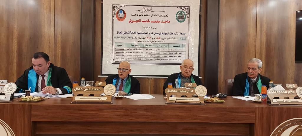 نوقشت اليوم الموافق ٢١ / ٢ / ٢٠٢٣ على قاعة عمادة كليتنا رسالة ماجستير لطالب الدراسات العليا في قسم علوم التربة والموارد المائية ماجد محمد خالد الجبوري والموسومة ( طبيعة الازدواجية الايونية في بعض الترب الجافة وشبه الجافة لشمالي العراق) حضر جانب منها السيد عميد الكلية الاستاذ الدكتور محمد يونس العلاف.