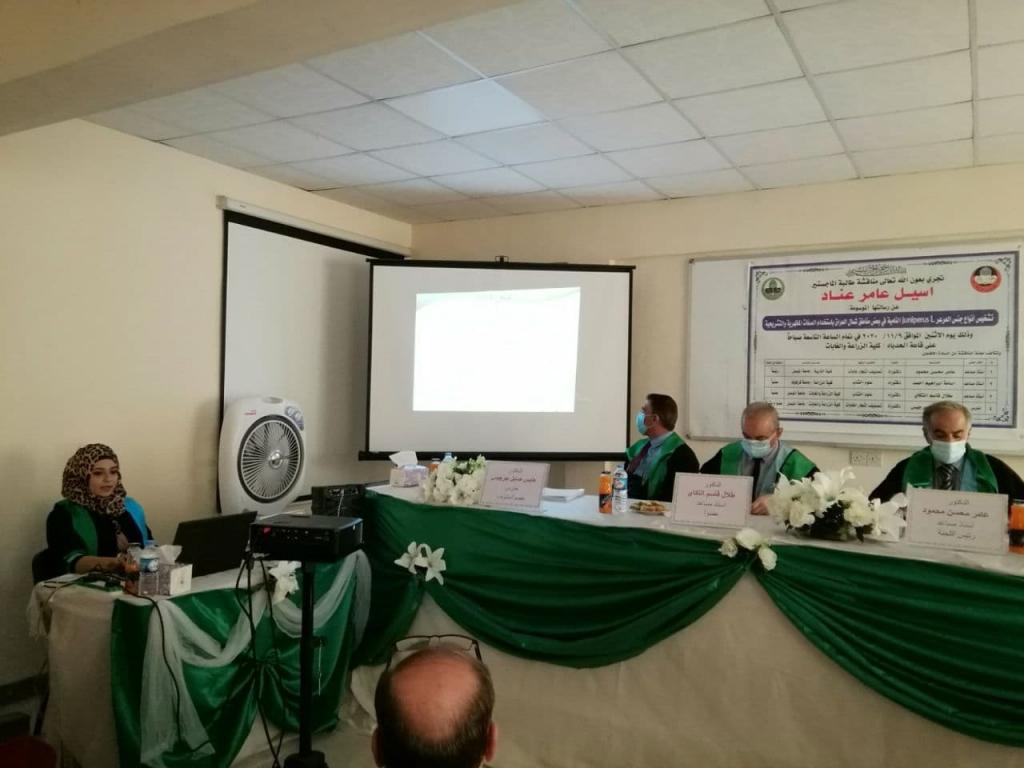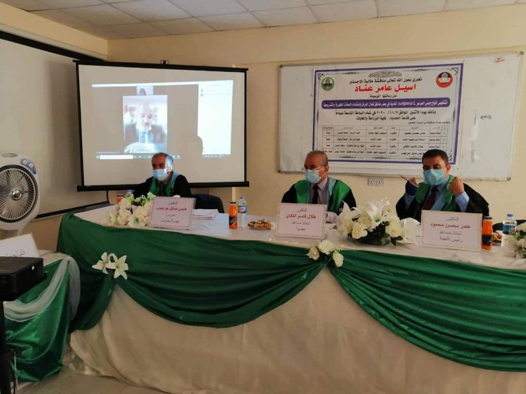 بحضور معاوني العميد للشؤون العلمية والإدارية نوقشت صباح اليوم الاثنين 2020/11/9 رسالة الماجستير لطالبة اسيل عامر عناد الموسومة (تشخيص أنواع جنس العرعر Juniperus L. النامية في بعض مناطق شمال العراق باستخدام الصفات المظهرية والتشريحية) وقد تألفت لجنة المناقشة كل من الأستاذ المساعد الدكتور عامر محسن محمود رئيسا ً والأستاذ المساعد الدكتور أسامة إبراهيم احمد من جامعة كركوك عضوا ً والاستاذ المساعد الدكتور طلال قاسم التكاي عضوا ً والمدرس الدكتور هايس صايل جرجيس عضوا ً ومشرفا ً وقد قررت اللجنة قبول الرسالة ومنحها شهادة الماجستير