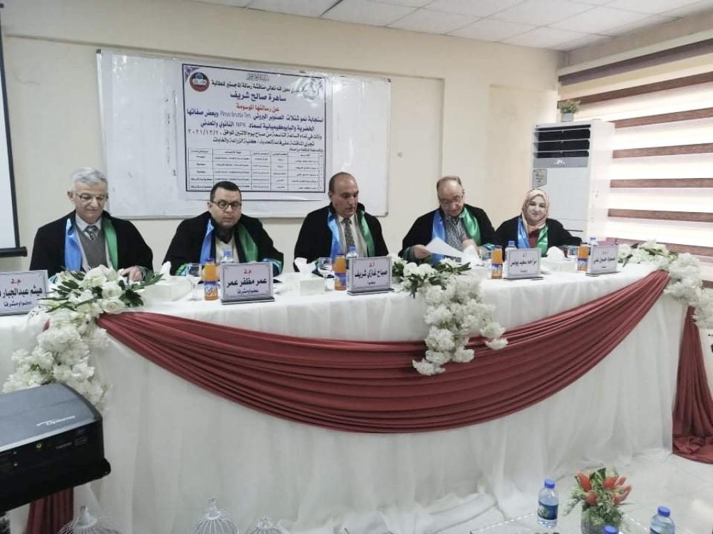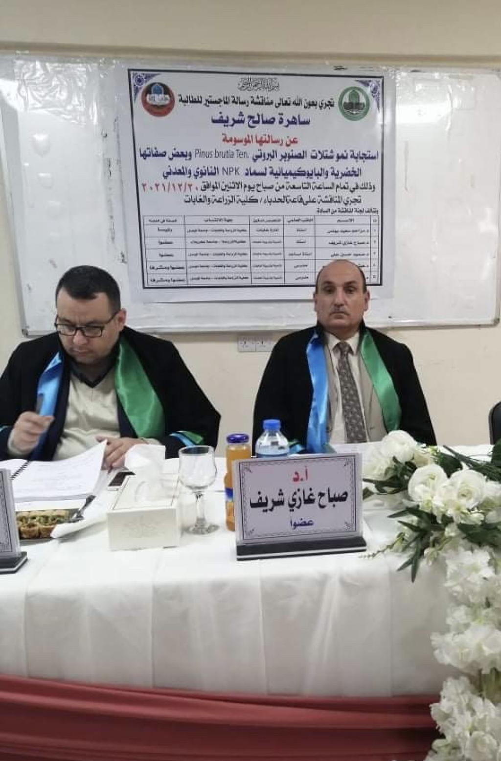 نوقشت صباح اليوم وعلى قاعة الحدباء في عمادة الكلية رسالة الماجستير في قسم علوم الغابات والتي تقدمت بها الطالبة ساهرة صالح شريف والموسومة (استجابة بعض صفات النمو لنوعين من السماد المركب NPK النانوي والتقليدي في شتلات الصنوبر البروتي .Pinus brutia Ten) حضر الاستاذ الدكتور محمد يونس العلاف عميد الكلية ومعاونه الإداري جانب من المناقشة.