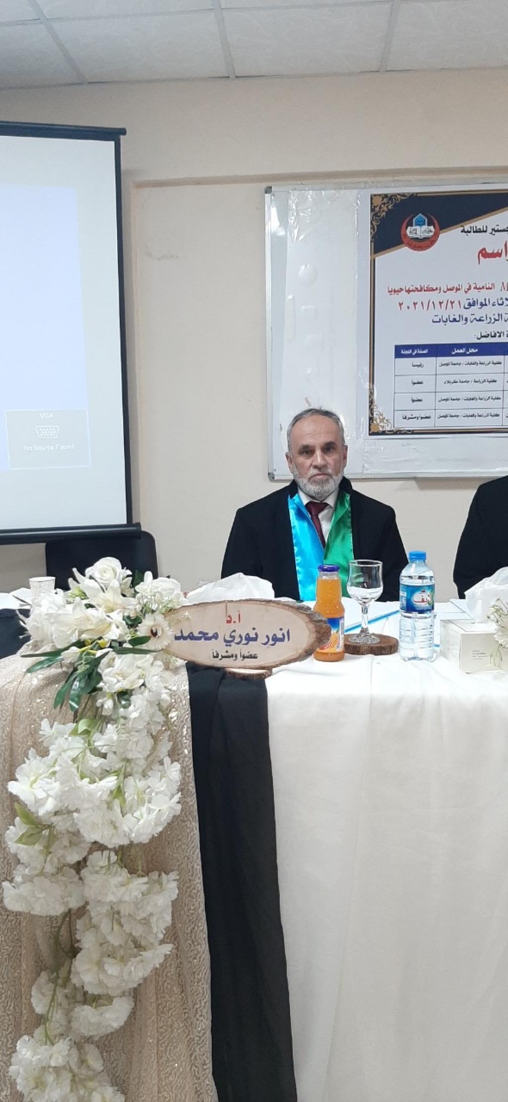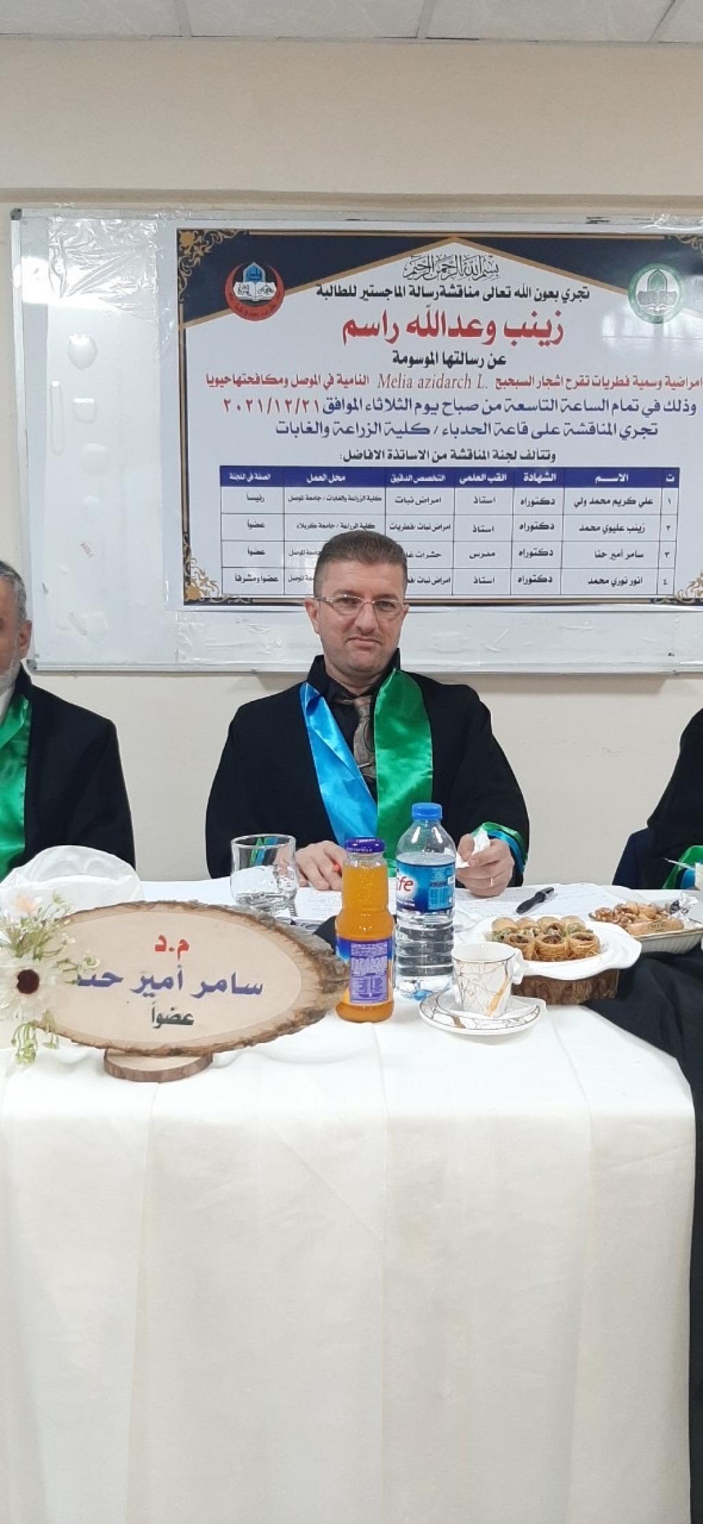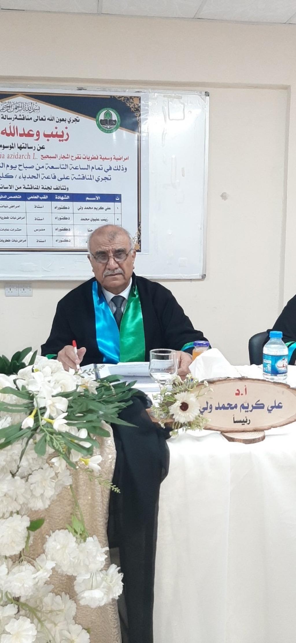 نوقشت صباح اليوم وعلى قاعة الحدباء في عمادة الكلية رسالة الماجستير في قسم علوم الغابات والتي تقدمت بها الطالبة زينب وعدالله راسم والموسومة ( امراضية بعض فطريات تقرح اشجار السبحبح Melia azedarach ومكافحتها باستخدام الفطر Trichiderma harzianum) حضر الاستاذ الدكتور محمد يونس العلاف عميد الكلية جانب من المناقشة.