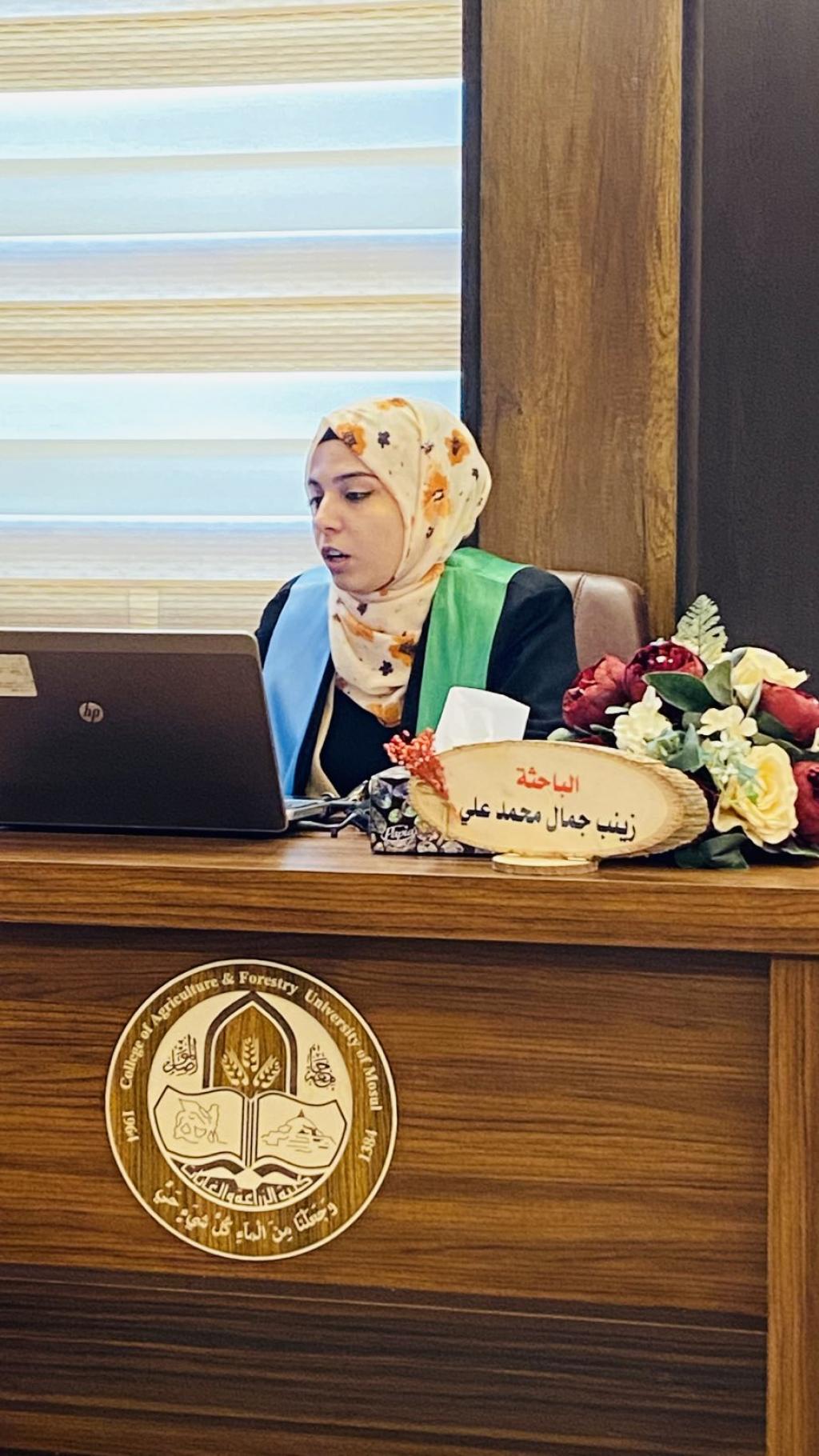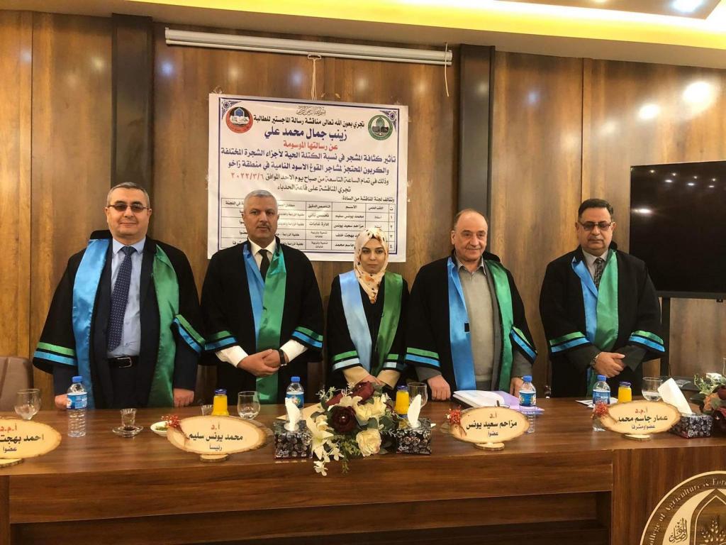 نوقشت صباح اليوم وعلى قاعة عمادة الكلية رسالة ماجستير في قسم علوم الغابات والتي تقدمت بها الطالبة زينب جمال محمد والموسومة ( تأثير كثافة المشجر في نسبة الكتلة الحية لاجزاء الشجرة المختلفة والكربون المحتجز لمشاجر القوغ الاسود النامية في منطقة زاخو )