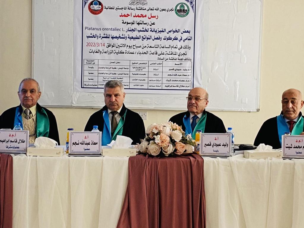 نوقشت صباح اليوم رسالة ماجستير في قسم علوم الغابات والتي تقدمت بها الطالبة رسل محمد احمد والموسومة ( بعض الخواص الفيزيائية لخشب الچنار النامي في كركوك وفصل النواتج الطبيعية وتشخيصها للقشرة والخشب ) حضر جانب منها السيد عميد الكلية الاستاذ الدكتور محمد يونس العلاف.