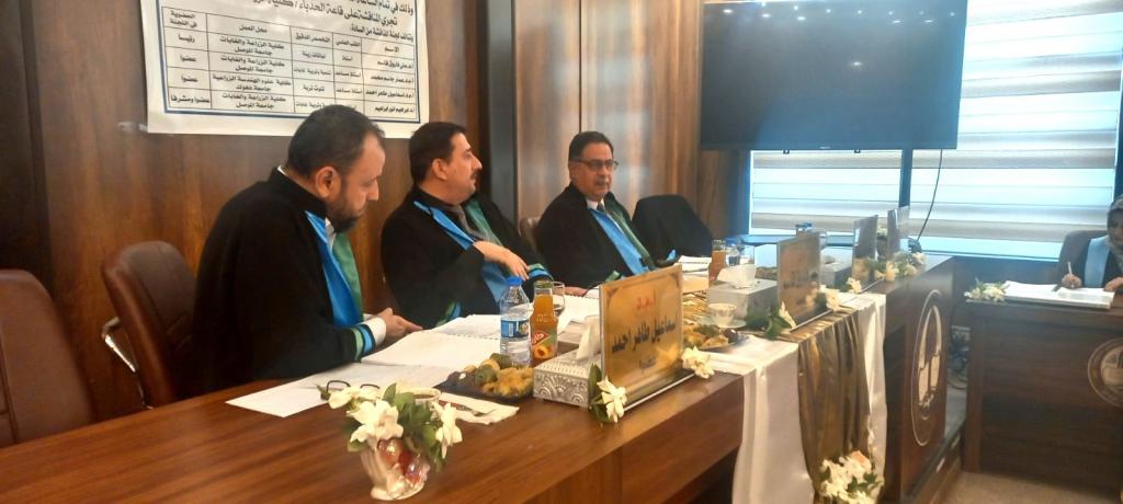 هذا وترأس لجنة المناقشة الاستاذ الدكتور علي فاروق المعاضيدي وعضوية الاستاذ المساعد الدكتور عمار جاسم اليوسف والاستاذ المساعد الدكتور اسماعيل طاهر احمد وبإشراف الاستاذ الدكتور ابراهيم انور ابراهيم