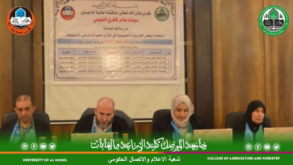 تناولت الرسالة التي تقدم بها الطالب ( محمد حامد مصطفى ) في قسم علوم الغابات ( دراسة حياتية نوعين من الدعاسيق واستخدامهما في المكافحة الحيوية لحشرة مَنِّ أوراق الحور في مدينة الموصل)، بهدف تقديم حلول بيئية بديلة للمكافحة الكيميائية تسهم في تقليل الاعتماد على المبيدات الكيميائية الضارة بالبيئة ألا وهي المكافحة الحيوية، إذ هدفت الدراسة إلى تحديد الكفاءة الافتراسية للدعسوقة ذات النقاط السبع والدعسوقة ذات النقاط الإحدى عشرة في مكافحة حشرة مَنِّ أوراق الحور حيوياً، كذلك شملت تقييم تأثير الكثافة السكانية لحشرة المَنّ على الأداء الافتراسي لنوعي دعاسيق الدراسة، ودراسة التداخلات بين الأعمار اليرقية والكثافات المختلفة للمَنِّ لتحديد الفعالية المثلى لكل نوع من الدعاسيق في ظروف مختبرية مسيطر عليها، ترأس لجنة المناقشة الاستاذ الدكتور انور نوري محمد وعضوية كل من الدكتور عمر مظفر عمر والدكتور محمد يوسف سيد غني وبإشراف وعضوية الدكتور سامر امير حنا.